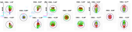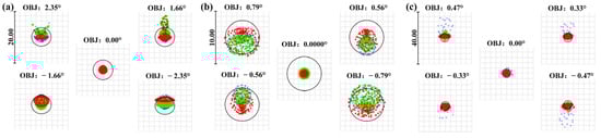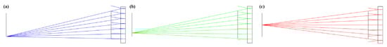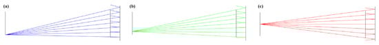 Spot diagrams of the VIS channel at focal lengths of 69 mm (a), 207 mm (b), and 345 mm (c). Blue: wavelength of 0.486 μm; green: wavelength of 0.588 μm; red: wavelength of 0.656 μm.