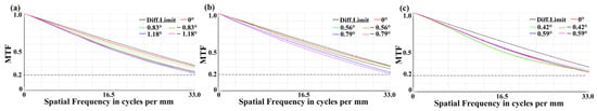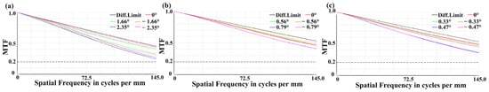 MTF curves of the VIS channel at focal lengths of 69 mm (a), 207 mm (b), and 345 mm (c). The MTF value at the horizontal dashed line is 0.2.