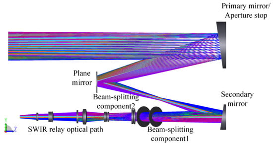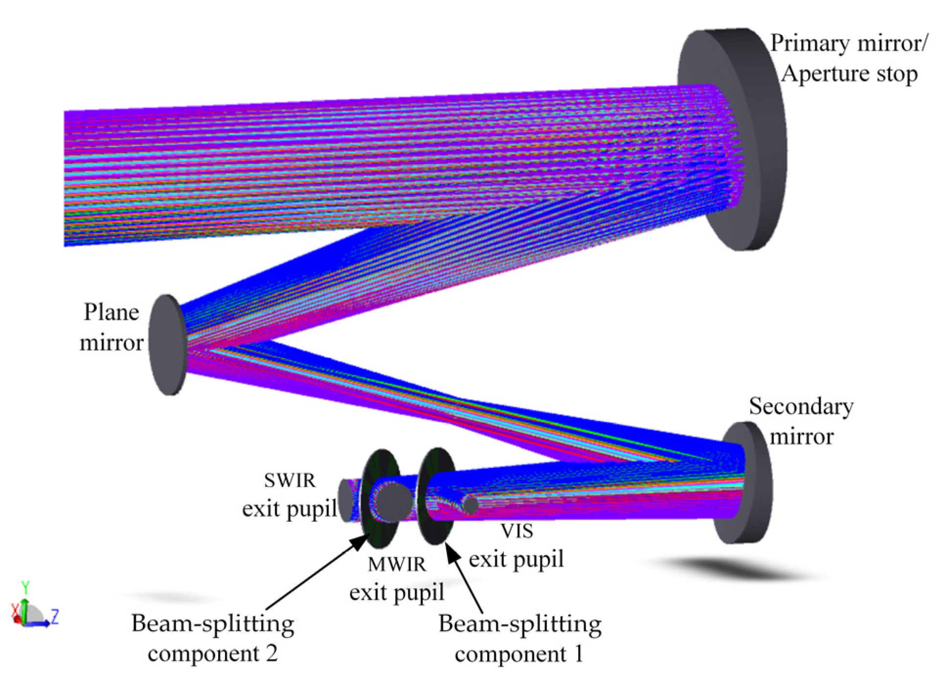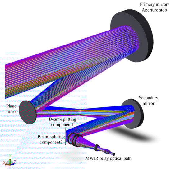 In recent years, optical imaging has been developing towards long-distance and high-resolution imaging, which has promoted the continuous increase in the aperture and focal length of optical systems [9]. Reflective and catadioptric structures have thus become the main approaches to ensuring that long-focal-length, large-aperture systems are compact and lightweight. Kailin Zhang et al. [10] designed a common-aperture optical system, covering VIS, short-wave infrared (SWIR) and MWIR channels and using a Cassegrain catadioptric structure, with a maximum focal length of 1360 mm and an F-number of 7.10. Lei Zhang et al. [11] added even-order aspheric lenses to the Ritchey–Chretien structure to develop a common-aperture system, which includes VIS and long-wave infrared (LWIR) channels, and a laser ranging channel. This system has a maximum focal length of 300 mm and a maximum entrance pupil aperture of 100 mm. Wei Yue et al. [9] designed a three-channel common-aperture system. The common-aperture optical path adopts a Cassegrain structure, and a dichroic mirror is used to transmit LWIR. Jiadong Yu et al. [12] designed a common-path optical system covering the VIS to SWIR bands, with a focal length of 1680 mm and an entrance pupil diameter of 180 mm. The system, employing an off-axis four-mirror configuration, eliminates central ray obstruction, compared with common-aperture systems based on the Cassegrain configuration and its variants, but has a narrower spectral bandwidth.