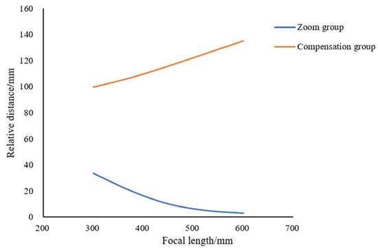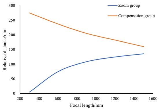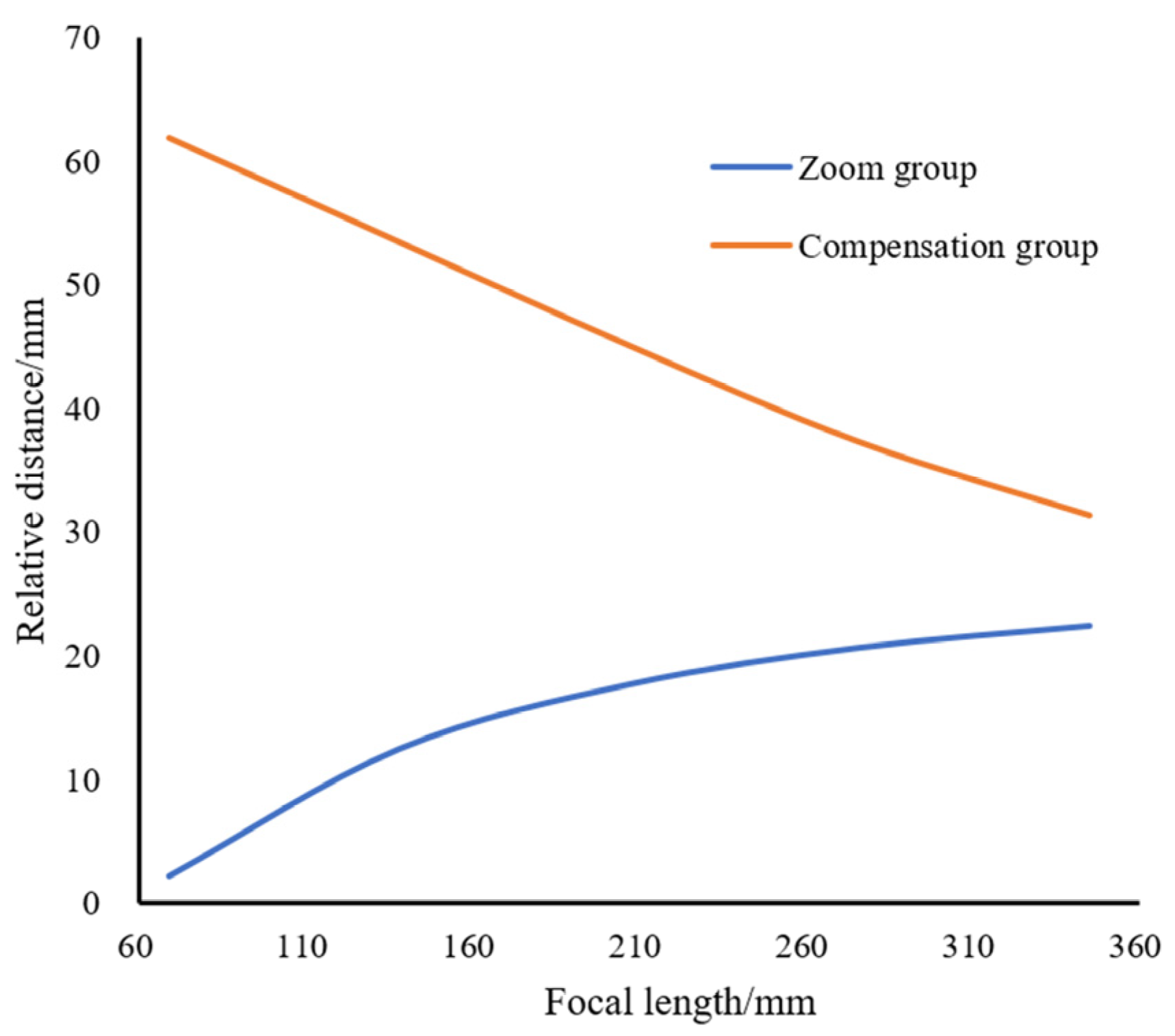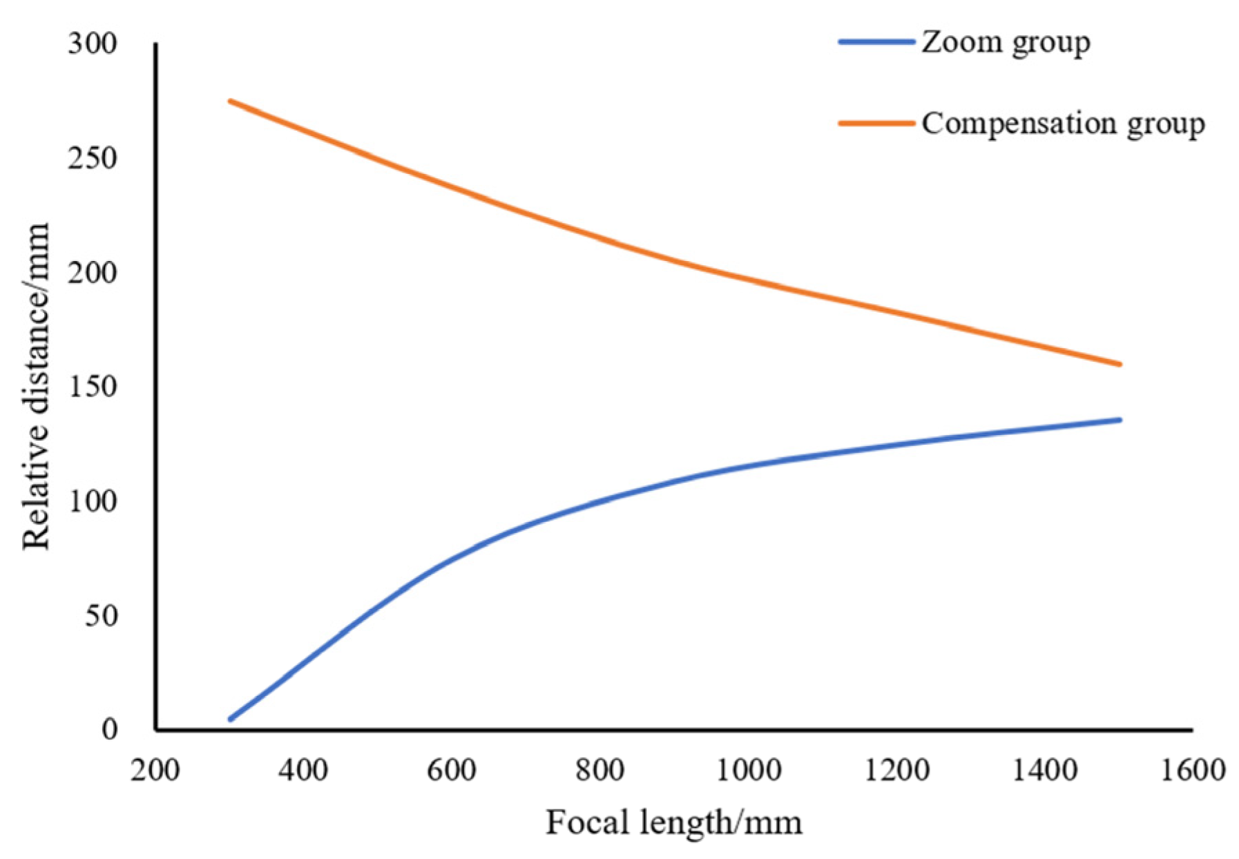 Figure 11 shows the zoom curve of the VIS channel, where the x-axis represents the focal length and the y-axis represents the distances of the zoom group and the compensation group relative to the fixed front group. The results indicate that the zoom curve is smooth.