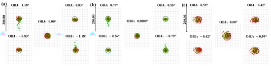 Spot diagrams of the MWIR channel at focal lengths of 300 mm (a), 450 mm (b), and 600 mm (c). Blue: wavelength of 3.7 μm; green: wavelength of 4.2 μm; red: wavelength of 4.8 μm.