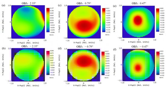 Wavefront distribution of the MWIR channel at focal length 300 mm, 1 FOV (a); 300 mm, −1 FOV (b); 450 mm, 1 FOV (c); 450 mm, −1 FOV (d); 600 mm, 1 FOV (e); 600 mm, −1 FOV (f).