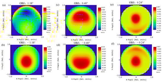 Wavefront distribution of the SWIR channel at focal length 300 mm, 1 FOV (a); 300 mm, −1 FOV (b); 900 mm, 1 FOV (c); 900 mm, −1 FOV (d); 1500 mm, 1 FOV (e); 1500 mm, −1 FOV (f).