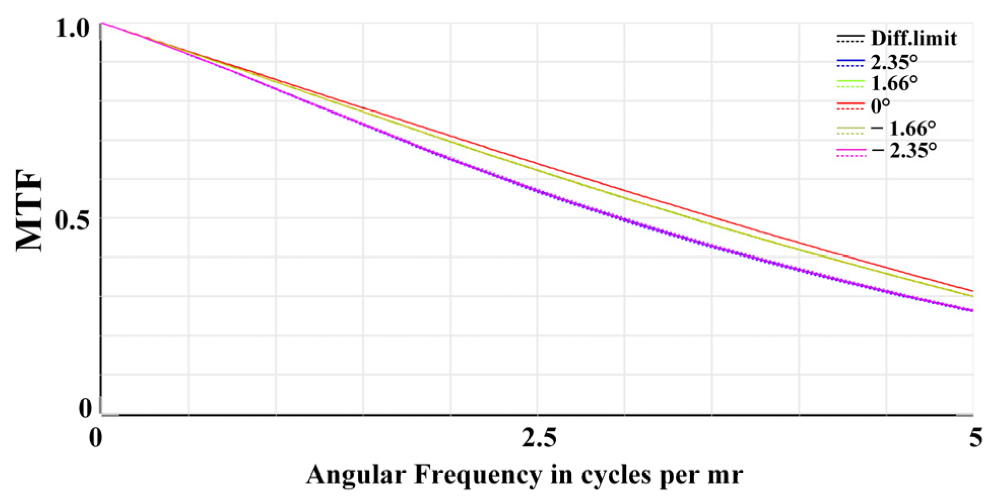 In Figure 13, SWIR rays emerge from the common-aperture optical path and then pass through the beam-splitting components to form an image on the detector. The spot diagrams of the SWIR channel are presented in Figure 14. The RMS of spots ranges from 3.767 to 7.657 μm, which is smaller than the detector’s pixel size, providing reliable assurance for the imaging. Figure 15 shows the MTF curves of the channel at a cutoff frequency of 33 lp/mm. The results indicate that the MTF curves of the central FOV are nearly close to the diffraction limit, and the MTF values of the edge FOV are all above 0.2, confirming that the channel possesses excellent imaging performance.