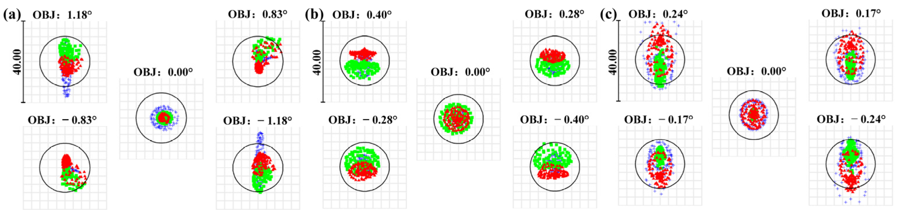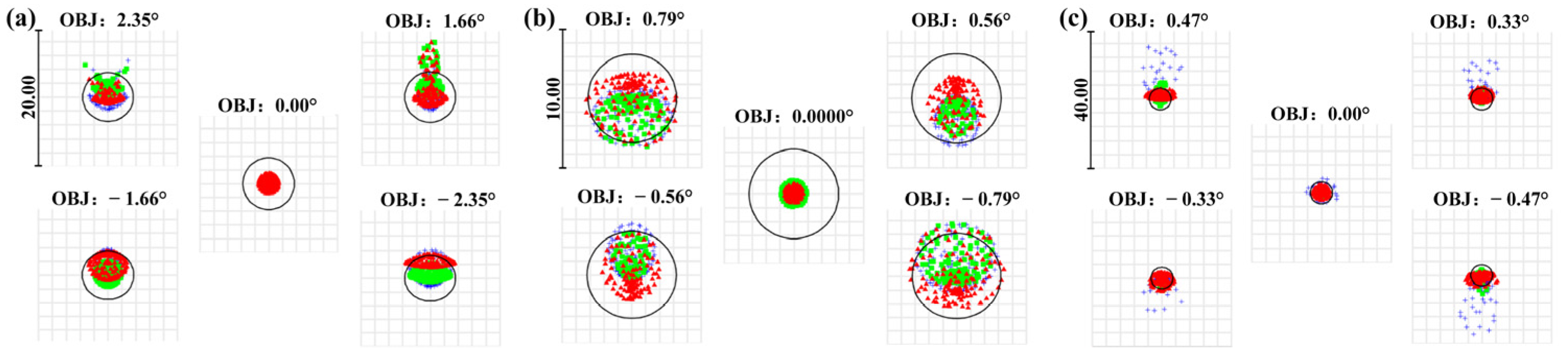 - Xing, Y.; Yu, J.; Wang, X.; Li, H.; He, C.; Ma, Z.; Wang, D.; Wang, Z.; Cheng, X.; Dun, X. Comprehensive performance domain tolerance analysis methodology for freeform imaging spectrometers. Opt. Express 2024, 32, 14405–14419. [Google Scholar] [CrossRef]