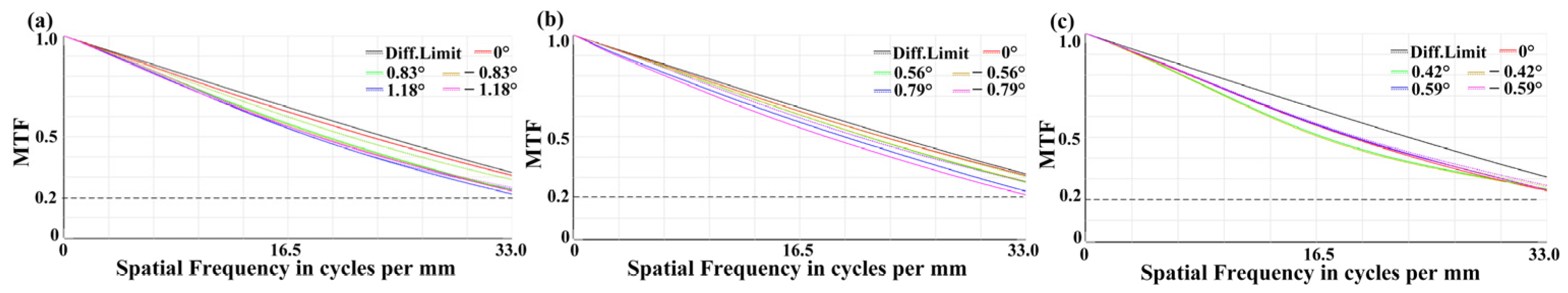 In Figure 18, MWIR rays emerge from the common-aperture optical path, pass through component 1, are reflected by component 2 into the relay optical path, and finally form an image on the detector. The spot diagrams of the MWIR channel are presented in Figure 19. The RMS across different FOVs at various focal lengths ranges from 4.638 to 14.983 μm, which is smaller than the detector’s pixel size, providing reliable assurance for the imaging. Figure 20 shows the MTF curves of the channel at different focal lengths, with a cutoff frequency of 33 lp/mm. The results indicate that the MTF values are above 0.2, confirming that the system possesses excellent imaging performance.