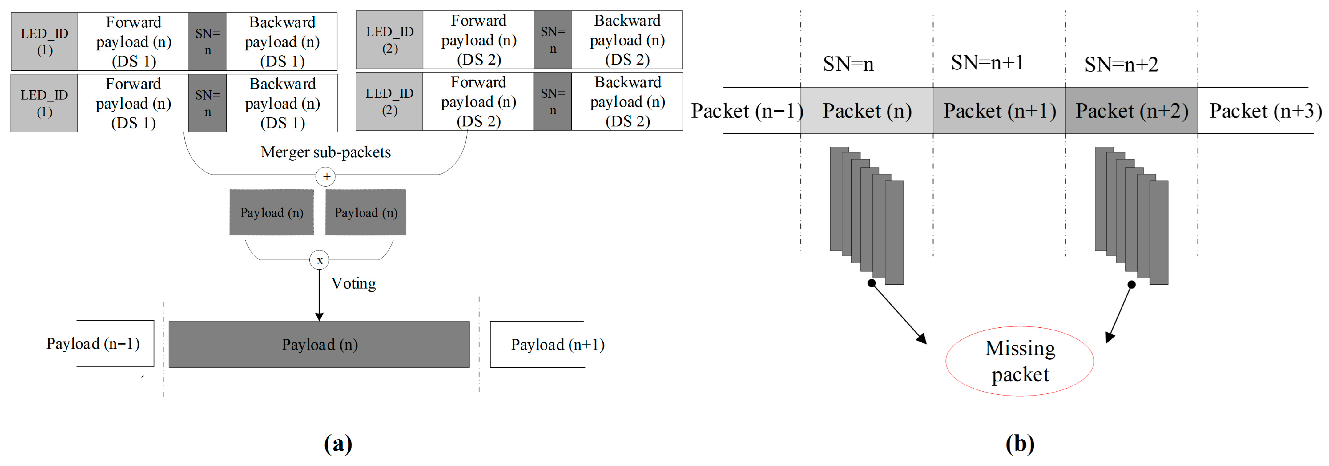 - Frame rate variation support: Camera frame rate variation effect cause packet loss at the receiver side. Although many systems assume a constant frame rate (e.g., 30 or 1000 fps), this rate may differ across devices, making synchronization between LEDs and the camera challenging. To address this issue, we insert a sequence number (SN) that helps identify the differences between the frame rate and the packet rate on the receiver/transmitter sides, respectively. From that, we can increase the communication performance.