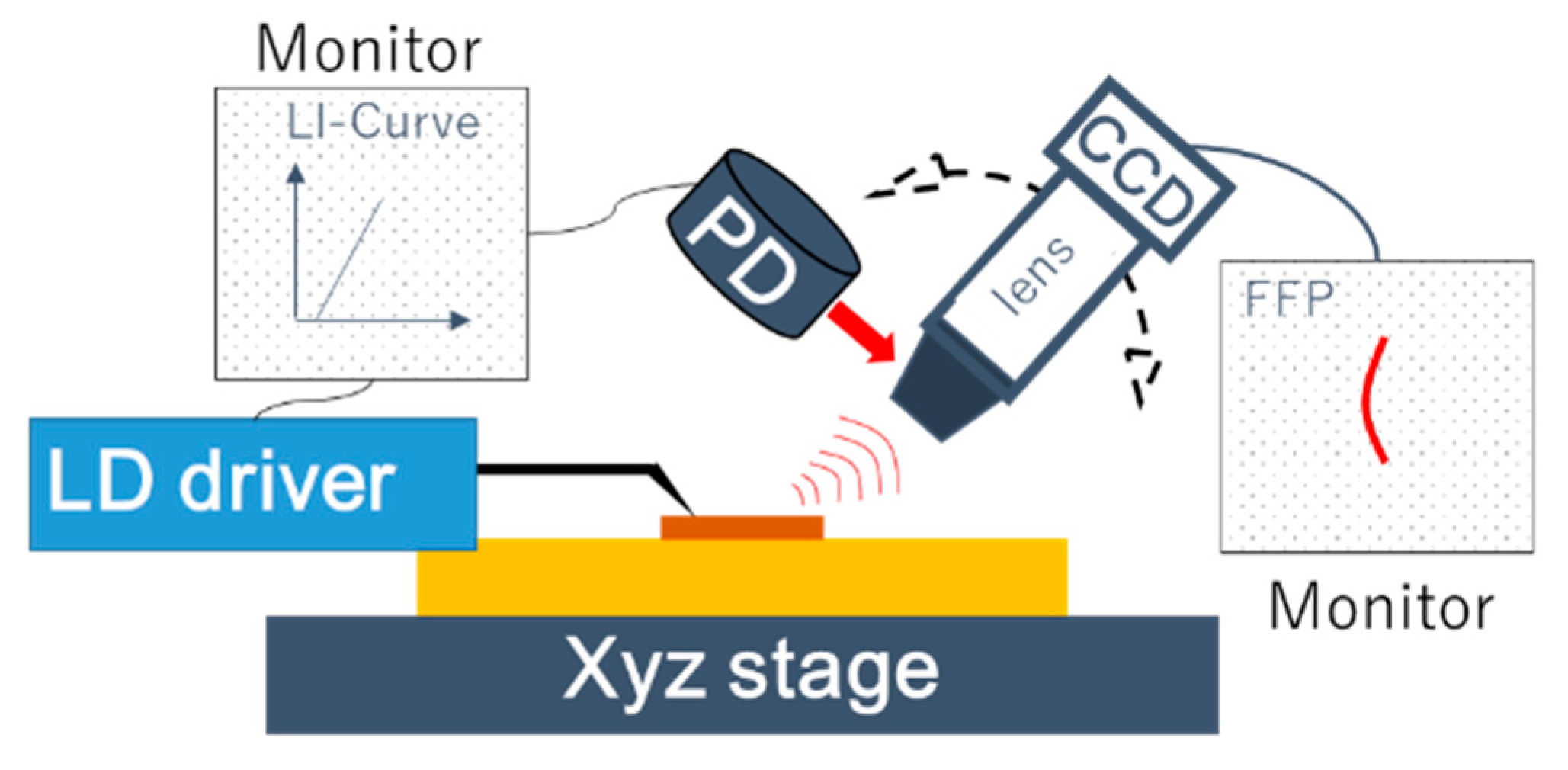 The experimental setup used for device characterization is schematically illustrated in Figure 2. The FFP of the fabricated beam scanner was analyzed using a high-resolution optical measurement system (Synos M-Scope, Synergy Optosystems Co., Ltd., Shizuoka, Japan). To accurately capture the emitted beam profile, the CCD camera was mounted on a precision rotational stage, enabling precise alignment with the oblique emission angle (θ) of the amplified slow-light mode. Spectral measurements were performed using a multimode optical fiber (MMF) tilted at the emission angle θ to match the propagation direction of the slow-light mode. The MMF was connected into an optical spectrum analyzer (AQ6317, Ando Electric Co., Tokyo, Japan; now Yokogawa Electric Corp.) with a spectral resolution of 0.02 nm.