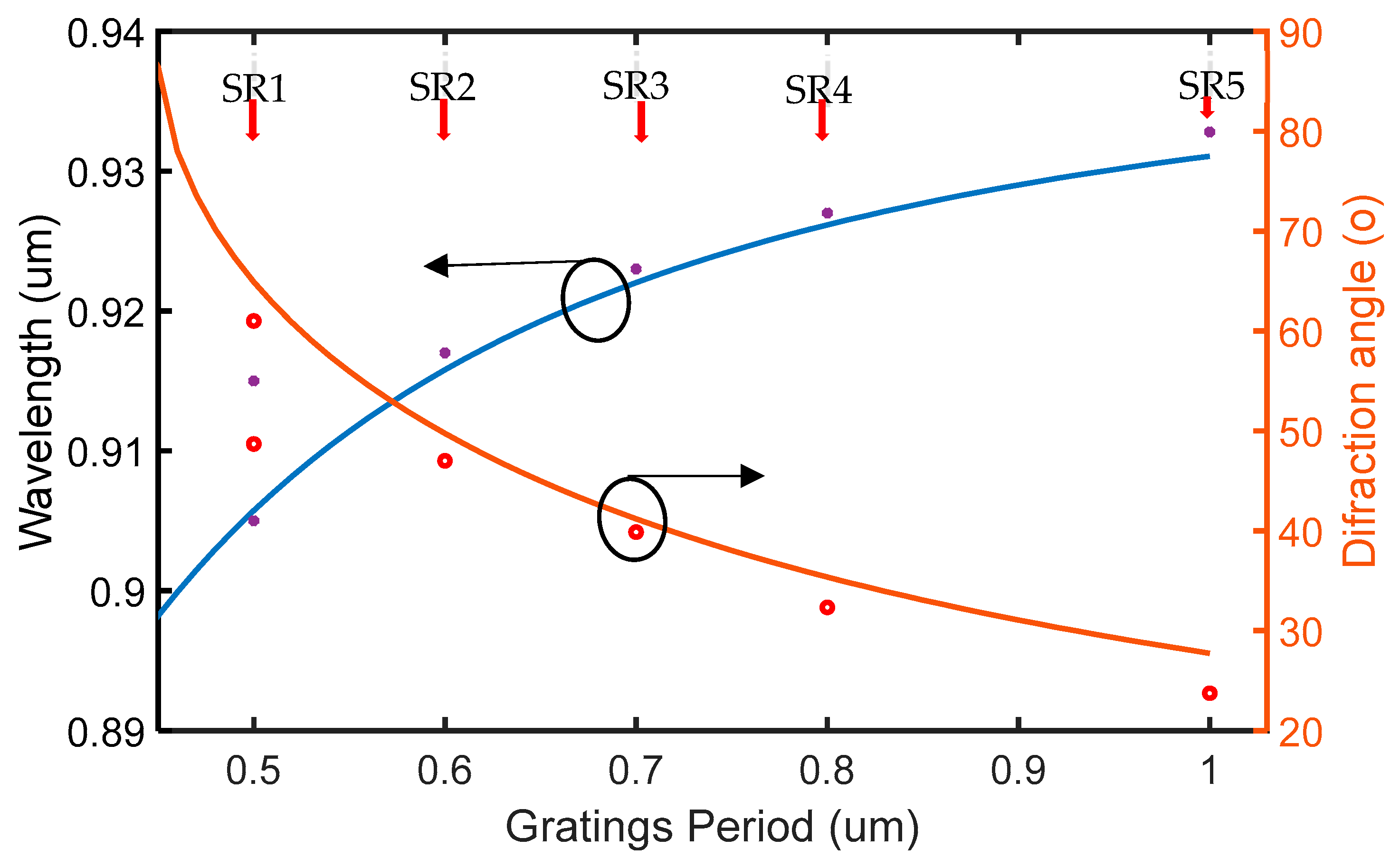 A wet-etched 30 nm surface grating provides optimized coupling for selective slow-light mode excitation [29,36]. Five distinct surface-grating periods were designed and fabricated: SR1 = 0.5 μm, SR2 = 0.6 μm, SR3 = 0.7 μm, SR4 = 0.8 μm, and SR5 = 1.0 μm, with SR1–SR4 spaced by 100 nm. All devices operate in the first-order diffraction regime [37]. The investigated VCSEL array comprises five grating configurations arranged in a 5-unit linear array.