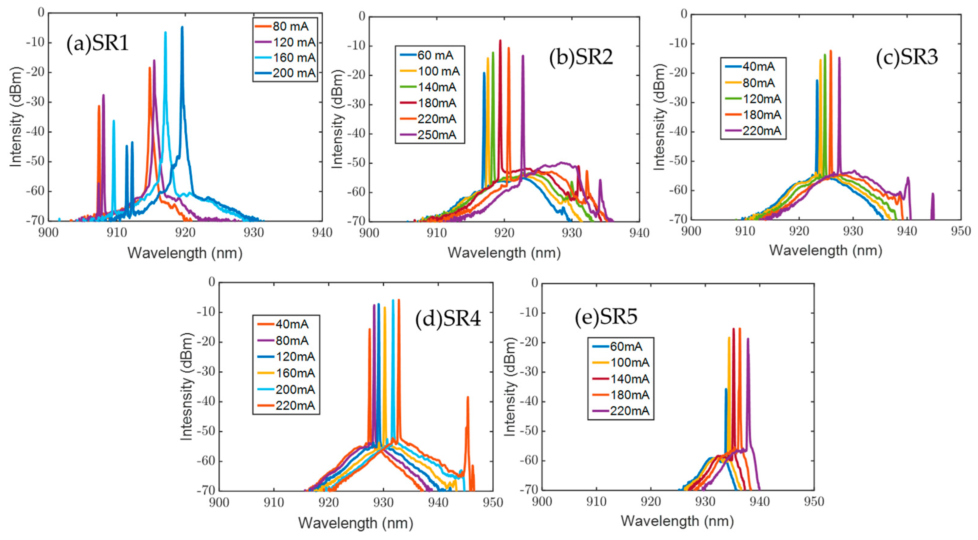 Figure 5. (ae) Spectra of seed lasers at different injection currents. The measurement span is 50 nm to display all possible modes.