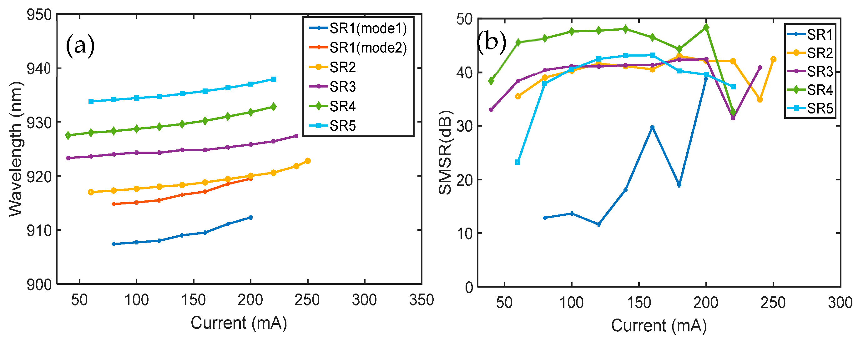 For SR1, dual-mode operation is observed, consisting of a weak mode at approximately 905 nm and a dominant mode near 915 nm, which is closer to the material gain peak. At high injection currents, SR2–SR4 show weak spectral features corresponding to vertical-cavity-like modes. Nevertheless, slow-light-mode lasing remains dominant, and SMSRs remain above 30 dB throughout the operating current range, indicating that parasitic vertical modes do not significantly degrade beam quality or spectral purity. Figure 6a,b show the wavelength tuning characteristics and corresponding SMSR values of all seed lasers as functions of injection current. The SR1 device exhibits a tuning range of 4.7 nm for its dominant mode, while SR2 demonstrates the largest tuning range of 5.8 nm. Devices SR3, SR4, and SR5 exhibit tuning ranges of 4.1 nm, 5.3 nm, and 4.1 nm, respectively. These variations mainly result from differences in the maximum usable current before roll-over, influenced by slight oxide aperture variations.