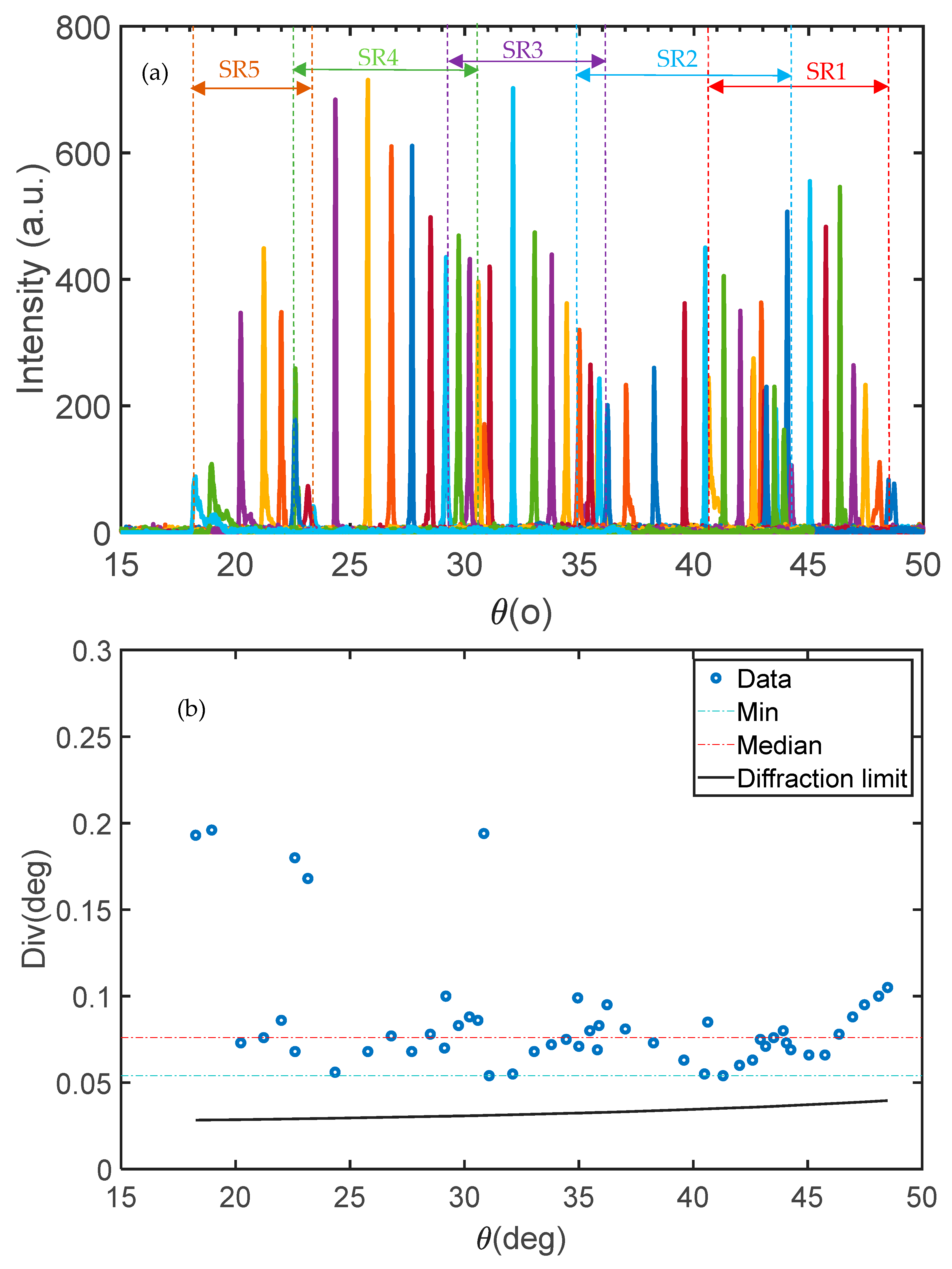 Figure 8. (a) Measured FFP of beam scanner devices in array form (SR1 to SR5). Beam steering is controlled by current tuning of the seed lasers. (b) Beam divergence fluctuations plotted for each deflection angle.
