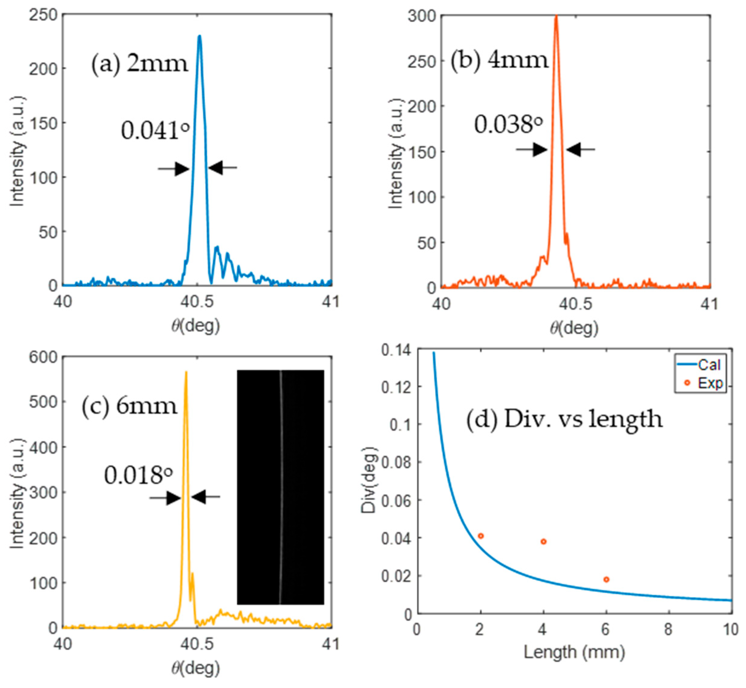 Figure 8b summarizes the full width at half maximum (FWHM) beam divergence as a function of deflection angle (θ) for the 2 mm amplifier devices. The measured divergence values predominantly fluctuate around 0.076°, with the minimum divergence recorded at approximately 0.054°. For comparison, the theoretical diffraction-limited divergence for the 2 mm amplifier (~0.033°) is also shown in Figure 8b.