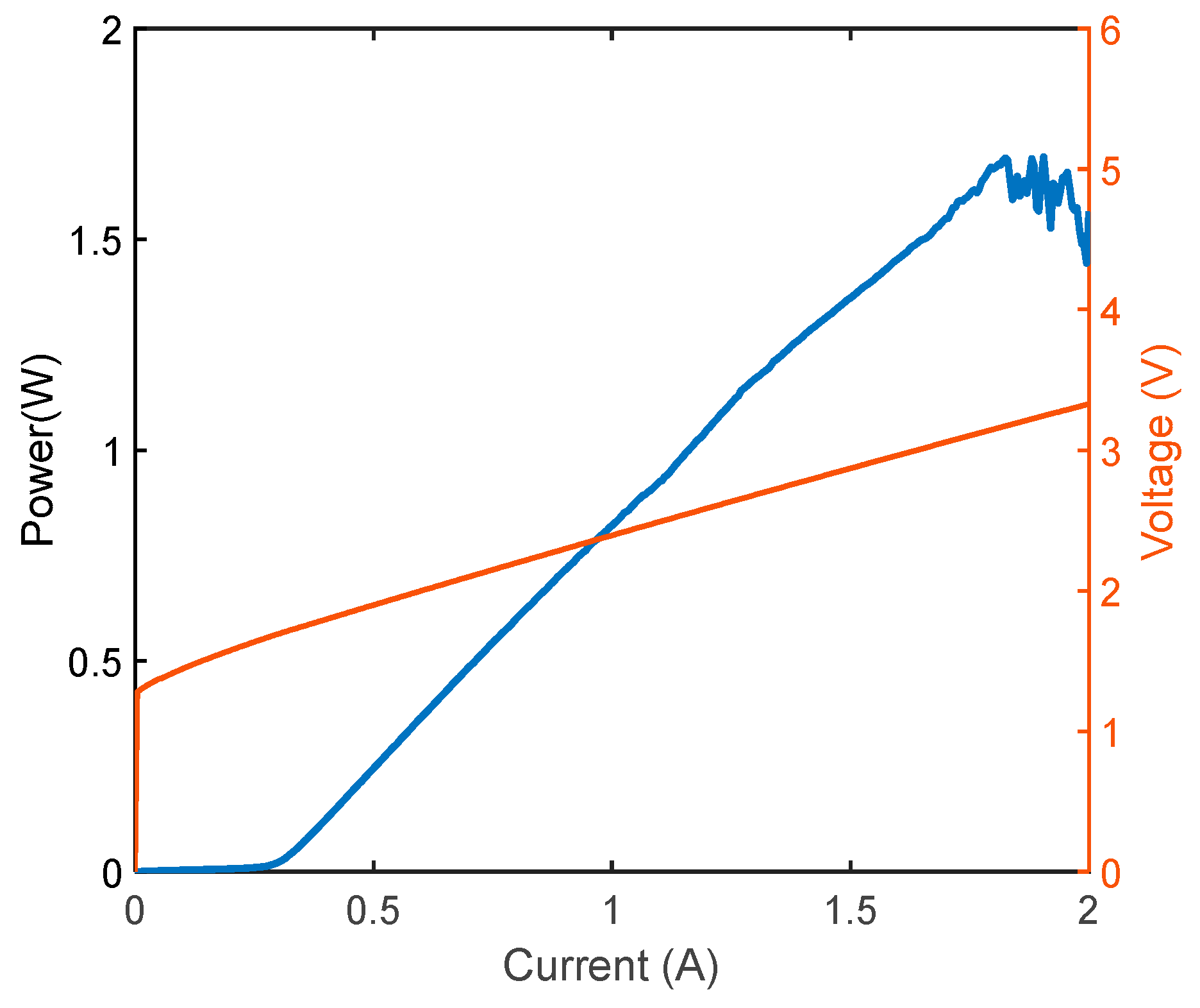 In addition to ultra-low beam divergence, high optical output power is critical for LiDAR, especially in long-range applications. Figure 10 shows the L–I–V characteristics of the 6 mm amplifier, measured in continuous-wave operation at room temperature without external cooling. The 0.3 mm seed laser was biased at 160 mA, while the amplifier current increased up to 2 A. The device exhibits a threshold current of ~300 mA and a high slope efficiency of 1.2 W/A, attributed to unidirectional slow-light propagation in the grating-free amplifier. A maximum output power of 1.69 W was achieved at an injection current of 1.82 A, beyond which power roll-off is observed, likely arising from thermal effects and the onset of in-plane optical modes. As shown in the L–I–V curves of Figure 10, the wall-plug efficiency of the devices remains around 30%, even for extended 6 mm devices.