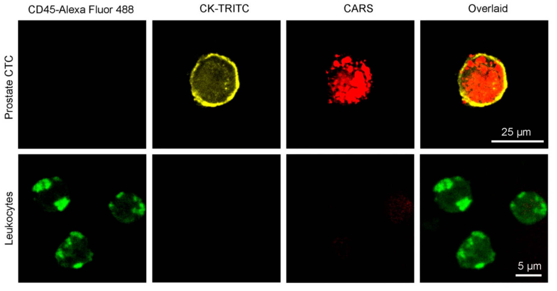 - Mitra, R.; Chao, O.; Urasaki, Y.; Goodman, O.B.; Le, T.T. Detection of lipid-rich prostate circulating tumour cells with coherent anti-Stokes Raman scattering microscopy. BMC Cancer 2012, 12, 540. [Google Scholar] [CrossRef]