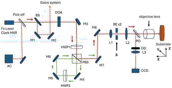 A schematic diagram of the optical layout setup is shown in Figure 1. The output from an ultrafast Regenerative Amplifier (Clark-MXR CPA 2010, (Dexter, MI, USA), τ = 200 fs, λ = 775 nm, 1 kHz, 1 mJ, M2 = 1.2) was attenuated and directed to a pulse burst generator delay line. This consists of a half-wave plate (HWP1), Glan laser polariser (polarisation beam splitter, PBS), 3 dielectric reflecting mirrors and internal half-wave plate (HWP2) within the loop, creating a reflected |V⟩-polarised pulse, followed by a series of circulating pulses, termed pulse burst, with output |H⟩ polarised. This type of delay line, used with a 10 ps laser source, was briefly described by us previously [27]. As the optical path length within the delay line was ΔL = 30.0 ± 0.5 cm, the intra-burst frequency was νIB = 1000.0 ± 1.6 MHz. Up to three pulses with equal energy could be created, or a series of pulses with decaying amplitude up to n > 5 and overlapped in the near field. After traversing a periscope, the beam was expanded by a ×2 magnification telescope (L1 = 50 mm; L2 = 100 mm) with a fast shutter placed close to the focal plane of lens L1. A thin-film pick-off with a focus lens allowed observation of the burst spot pattern on a Spiricon CCD camera, and it was physically overlapped on the CCD by careful adjustment of the delay line mirrors. This procedure ensured that the pulse bursts were also overlapped at the focus of the 0.55 NA objective (Nikon CFI LU Plan Epi ELWD 50×, working distance = 10.1 mm, Castle Donington, UK).