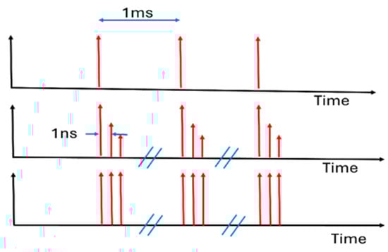 A schematic diagram of the burst generator output is shown in Figure 2, with 1 kHz fundamental frequency and 1 GHz intra-burst frequency. The relative setting of HWP1 and HWP2 allows for the generation of two pulse burst (1, 1, 0), (|V⟩, |H⟩, 0) and three pulse burst with orthogonal polarisations (|V⟩, |H⟩, |H⟩) with nearly equal energy. Pulse bursts with n > 3 and varying amplitude can also be generated.