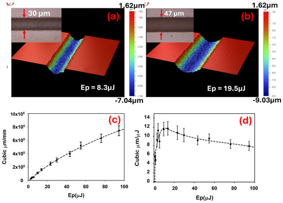 Material ablation was first investigated with the aid of a Galvo scanner (Nutfield), a 100 mm f-theta lens and Scan software (SCAPS GmbH, Samlight 3.5, Oberhaching, Germany). A series of tracks were machined while varying the pulse energy, Ep. Scan speed was s = 5 mm/s, with five overscans. Samples, which were mounted on a glass slide, were carefully brought to the lens focal plane on a four-axis micro-positioning stage, Aerotech Npaq (x, y, z, and θ). Effective NA = 0.05, with a focal spot size of D = (1.22 λ/NA)M2 = 22.7 μm; hence, the total pulse overlap is NT ~ 25 pulses/spot diameter. Figure 4a,b shows typical 3D surface profiles of scanned lines at Ep = 8.3 μJ and (fluence) F = 4.1 J cm−2, and EP = 19.5 μJ and F = 9.6 J cm−2, respectively, highlighting increased width and depth with fluence. The calculated ablation volume/mm of track in Figure 4c shows a weak quadratic dependence, while the ablation efficiency, or Specific Removal Rate (SRR), is shown in Figure 4d. This is defined as (V/nEp), the ablated volume per mm length divided by the total number of incident pulses of energy, Ep. This rises rapidly above threshold and then decays slowly, yielding <(V/nEP)> ~ 10 μm3/μJ. Threshold ablation energy is Eth ~ 0.8 μJ, (Fth ~ 0.4 Jcm−2), while ablation depth is d ~ 0.3 μm/pulse, with EP = 13.7 μJ. If d = α−1 Ln(Ep/Eth), then the absorption coefficient is α = α0 + βI = 9.5 × 104 cm−1 ~ βI, inferring that the two-photon absorption coefficient (2PA) is β ~ 2.9 cmGW−1 at peak intensity I ~ 3.3 × 1013 W cm−2. This may be typical of two-photon absorption coefficients in transparent, undoped polymers at such high intensity, where sequential photon absorption may lead to higher levels in the band structure following two-photon absorption [28]. In [28], the two-photon absorption coefficient converged in amorphous PolyEther (Ether) Ketone (PEEK) to β ~ 4.0 cm GW−1, with a peak intensity of I > 160 GW cm−2, while in [17], the 2PA coefficient for polyimide was assumed to be β ~ 1 cm GW−1, as the bandgap was similar to that of ZnO, and the 2PA coefficient for undoped polyimide was not reported.