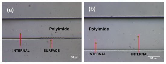 The inscription in Figure 6a,b appears to show light-guiding regions so that material modification likely resembles refractive index (RI) changes due to limited bond breaking at low-pulse overlap. These results indicate that exposure for material carbonisation needed to be higher—for example, by reducing scan speed/increasing pulse energy.