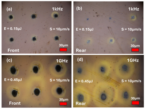 As carbonisation appeared very limited, as shown in Figure 12, scan speed was reduced by two orders of magnitude to s = 10 μm/s, corresponding to 100 pulses/μm. Pulse energy was EP = 0.15 μJ at 1 kHz, and total energy was ET = 0.45 μJ at 1 GHz, three-pulse burst. Array spacing was set at 100 μm. Figure 13 shows optical images of 1 kHz (a,b) and 1 GHz (c,d) front and rear surface modifications. The front surface at 1 kHz, as expected, shows similar surface ablation spots (~15 μm wide), while the rear modification is highly variable, with dimensions much reduced due to limited coupling and residual spherical aberration. At 1 GHz, the burst processing on the front surface is ~25 μm wide, while rear surface modification is much closer in dimension—however, rear surface variations between spots are still evident. Nevertheless, pulse burst gives more consistent results, and the material here looks carbonised. Interesting yellow ring structures appear around the spots at 1 GHz and may well be due to shock waves from laser–plasma absorption during pulse burst processing at pulse delays of 1 ns. Plasma expansion during ultrafast laser ablation typically occurs on the ns timescale [29].