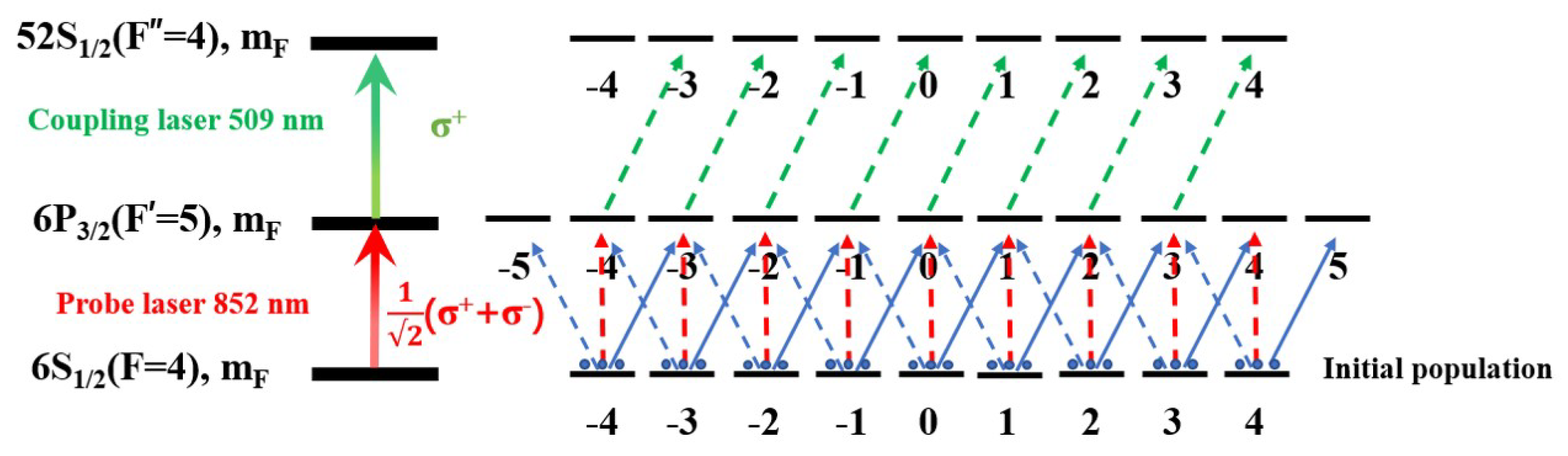 - Chang, R.; Wang, T.; Yang, Y.; Hao, L.; He, J.; Wang, J. Effect of the coupling beam with different intensity profile upon Rydberg EIT and Rydberg two-color polarization spectroscopy with Cesium ladder-type level. Adv. Quantum Technol. 2025, 8, 2400469. [Google Scholar] [CrossRef]