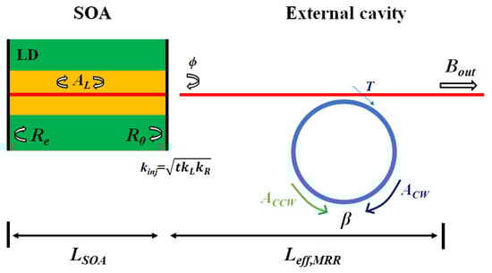 A simplified sketch of the SIL laser consisting of a laser diode (LD) and an external MRR can be described in Figure 1. Re and R0 are the reflectivity of the back facet and front facet of the single-mode LD, respectively. The optical power produced by the normalized mode-coupling rate between CW and CCW modes β is reflected back into the LD, locking the laser to the resonate frequency of the external MRR. As a result, the lasing frequency of the LD is narrowed and stabilized.