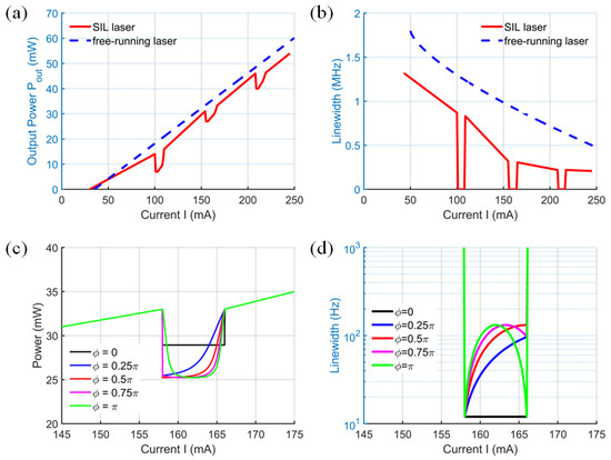 In the SIL regime, the output power exhibits abrupt decreases, as shown in Figure 2a. These features significantly differ from the Lorentzian resonance shape that would be observed without SIL [25], and all features have different shapes due to the varying injection phase. As shown by the black and orange solid lines in Figure 2c,d, a change in π in the injection phase causes the maximum output power to decrease from 33 mW to 25 mW, while the linewidth increases almost tenfold. Meanwhile, the frequency fluctuation caused by injection current variations is notably suppressed, as shown in Figure 2b,d.
