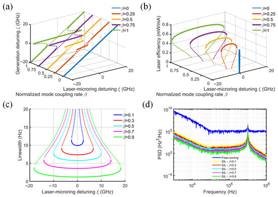 Figure 4 illustrates how the locking range, slope efficiency, linewidth, and PSD vary as the normalized mode-coupling coefficient β increases from 0 to 1 [28]. The injection phase ϕ is fixed at 0, the SOA intrinsic loss αi is set to 20 cm−1, the coupling efficiency kinj is 0.5, and the MRR Q-factor is 106. At β = 0, there is no optical feedback or self-injection locking, and the MRR functions as an external filter with additional diode–MRR coupling loss. As β increases, the locking range expands, while the slope efficiency increases monotonically and slowly. At β = 0.25, a fluctuation of 0.02 mW/mA occurs in the slope efficiency when the detuning frequency is increased from 0 to 5 GHz. The solid green line in Figure 4a,b shows that the slope efficiency can increase to 0.6 mW/mA at β = 1, with a locking range of 36 GHz. As illustrated in Figure 4c,d, increasing the normalized mode-coupling rate reduces the SIL laser linewidth, which aligns with previously reported experimental findings [11]. Increasing the reflectivity of the weak feedback from 0 to 0.32 reduced the intrinsic linewidth by a factor of six. Although the reduction occurs monotonically, the resulting linewidths remain within the same order of magnitude.