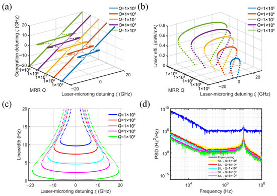 The impact of MRR Q-factor variation (105–109) on SIL laser performance is revealed in Figure 8, which depicts the variation in locking range, slope efficiency, linewidth, and PSD. The normalized mode-coupling rate β and the injection phase ϕ are set to 0.5 and 0, respectively. The SOA intrinsic loss αi is 20 cm−1, and the coupling efficiency kinj is 0.5. Note that as β is proportional to the MRR Q-factor, the locking band is effectively proportional to the ratio of the MRR to laser cavity quality factors, as demonstrated in Ref. [23]. A micro-ring external cavity with a Q-factor of 106–107 (red and orange solid lines) can be selected to achieve a slope efficiency of about 0.55 mW/mA and a locking range of ±10 GHz. A high Q-factor provides a longer effective optical length and narrow feedback light linewidth, which is conducive to achieving linewidth compression and frequency stabilization of the laser, as shown in Figure 8c,d.
