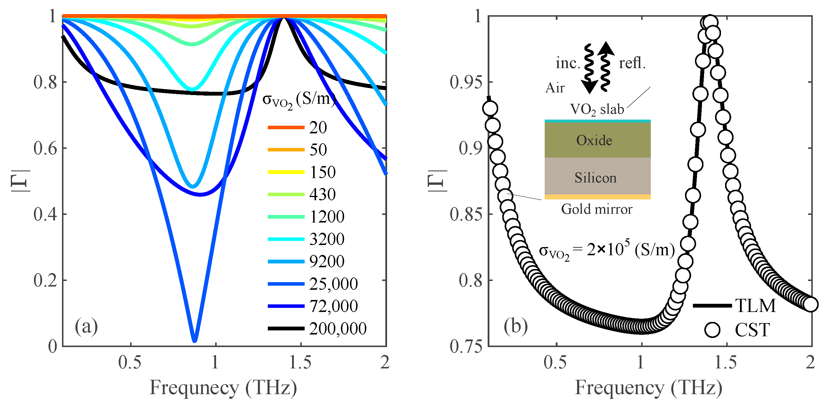 - Afra, T.; Fuscaldo, W.; Zografopoulos, D.C.; Natale, T.; Dell’Olio, F. Tunable wide band near-perfect absorber for terahertz waves based on a vanadium dioxide metasurface. Opt. Quantum Electron. 2025, 57, 272. [Google Scholar] [CrossRef]