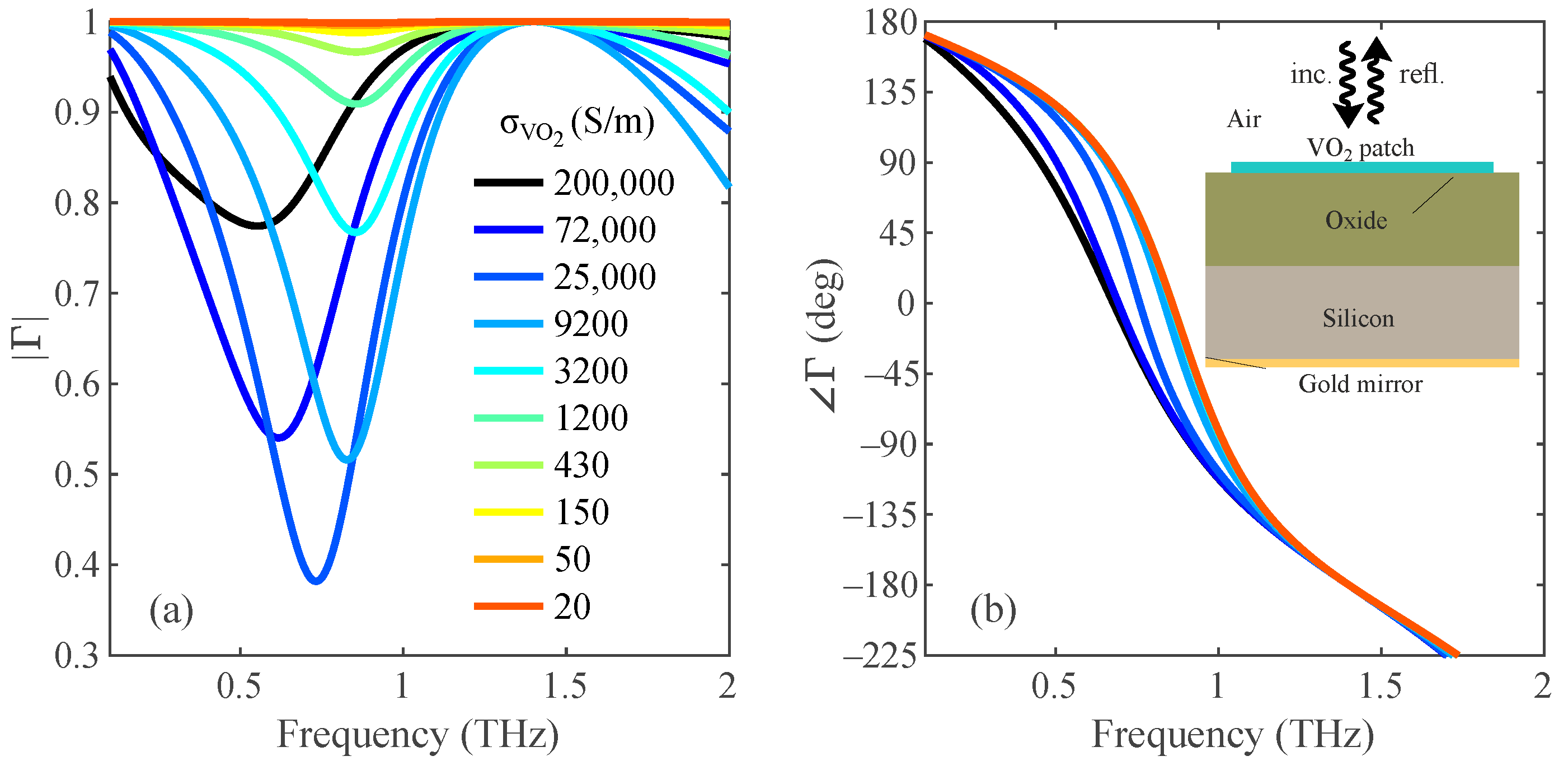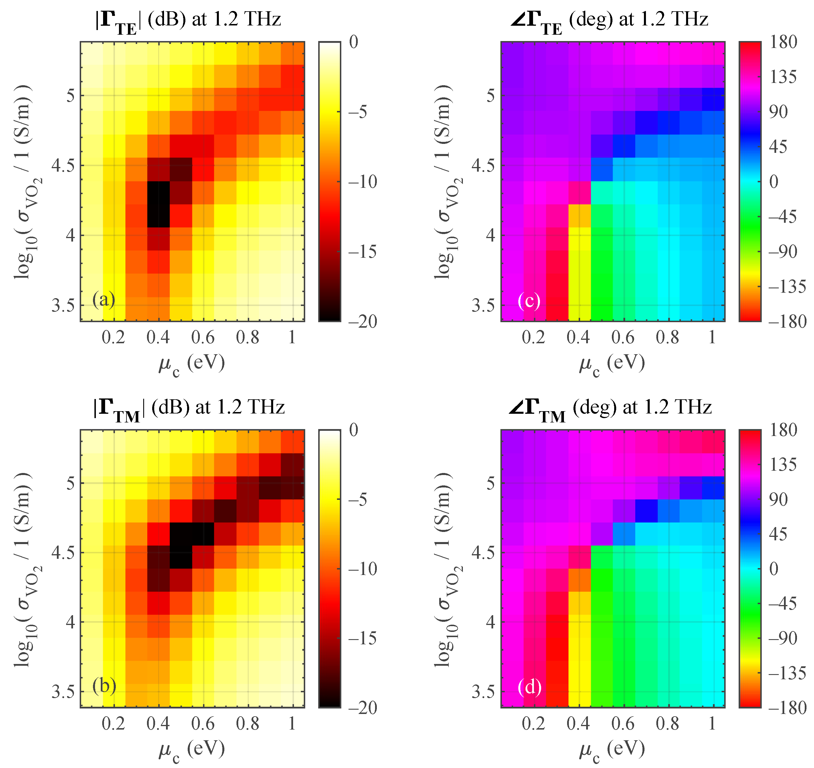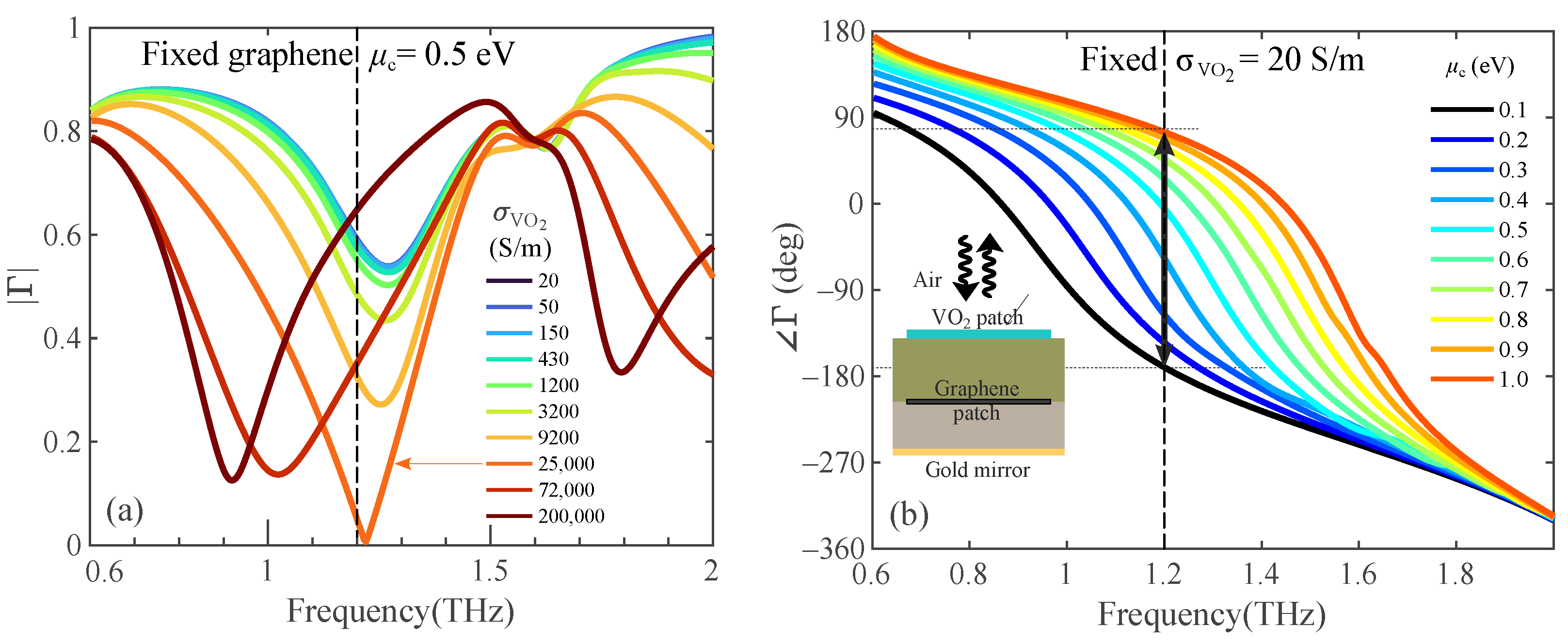 | This work | VO2–Graphene | 5 | THz | Simulation/ECM | Amplitude/Phase | Reflection/Absorption |