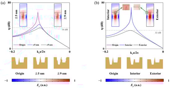 Here, (, ) and (, ) denote the upper and lower endpoints of the smooth sidewalls of the original UGR structure, respectively. The functions and are the built-in one-dimensional Gaussian random function and one-dimensional uniform random function in COMSOL Multiphysics, respectively. The variable denotes the spatial variable ranging from 0 to 1, is the scaling factor, is the spectral exponent parameter, is the maximum integer value of the spatial frequency, and m is the integer spatial frequency parameter. In this work, and are fixed at 20 and 1.3, respectively, and the sidewall roughness is controlled solely by varying . When = 10, the maximum deviation (indentation and protrusion) of the rough sidewall relative to the smooth sidewall of the original UGR structure is approximately ±5 nm. The middle figure in the bottom panel of Figure 4a provides a schematic illustration of the unit cell morphology in this case, and this structure exhibits an upward-to-downward radiation intensity ratio of 42.4 dB at kx = −0.106 (top panel of Figure 4a, blue line). When = 20, the maximum deviation increases to approximately ±9 nm. The right figure in the bottom panel of Figure 4a provides a schematic illustration of the unit cell morphology in this case, and this structure displays an upward-to-downward radiation intensity ratio of 36.4 dB at kx = −0.103 (top panel of Figure 4a, black line). In both cases, the UGR operates on the TE-A band and maintains nearly the same Q (~80) as the original UGR structure. The Ey mode distribution inset in the top panel of Figure 4a demonstrates that even when the sidewall smoothness deviates from the ideal design, the asymmetry ratio remains at a high level. Regarding material inhomogeneity, we considered two scenarios. In the first scenario, the film thickness in the central region of the unit cell is 10 nm lower than that in the surrounding regions; we denote this structure as “Interior”. The middle figure in the bottom panel of Figure 4b provides a schematic illustration of the unit cell morphology in this case. In the second scenario, the film thickness in the surrounding regions of the unit cell is 10 nm lower than that in the central region; we denote this structure as “Exterior”. The right figure in the bottom panel of Figure 4b provides a schematic illustration of the unit cell morphology in this case. Simulation results indicate that the “Interior” structure achieves a higher upward-to-downward radiation intensity ratio than the ideal original UGR structure at kx = −0.111, reaching 71.6 dB (top panel of Figure 4b, blue line). The “Exterior” structure also maintains a high asymmetry ratio of 31.9 dB at kx = −0.115 (top panel of Figure 4b, black line). The Ey mode distribution inset in the top panel of Figure 4b corroborates the robustness of the UGR under material inhomogeneity. In both scenarios, the operating band and Q show no significant deviation relative to the ideal original UGR structure. In summary, considering typical process variations and material yield levels, the topological state of the unit cell in the double-trapezoidal structure can maintain high stability, thereby meeting the requirements for practical production and providing assurance for the fabrication of efficient grating couplers.