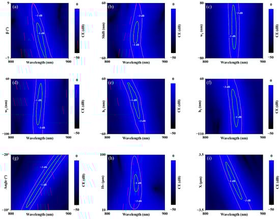 At the device level, Figure 5a–f (the vertical axis represents the deviation values) present contour plots of the CE as a function of key parameters—namely, the sidewall angle , alignment errors (shift), etching widths and , and etching depths and —across the operating wavelength range. The green and red contours denote the −1 dB and −3 dB CE thresholds, respectively. Figure 5a–f reveal that, over the 850 ± 10 nm bandwidth, the −1 dB tolerance windows for , shift, , , and are [−7, +3.5] °, [−32, +22] nm, [−56, +76] nm, [−76, +50] nm, [−30, +40] nm, and [−90, +30] nm, respectively. For the more relaxed −3 dB criterion, the tolerance window for is [−7, +8.5] ° and the tolerances for the other parameters exceed ±60 nm, which comfortably absorb the process variations typical of mass manufacturing. In particular, the case of −7° corresponds to perfectly vertical sidewalls.