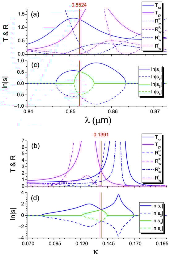 (a,b) Transmission and reflection spectra and (c,d) the logarithm of the scattering-matrix eigenvalues magnitude. Calculations were performed for at (a,c) μm and (b,d) μm, corresponding to the dashed lines in Figure 2b,c,e,f. Verical red line marks the position of EP.