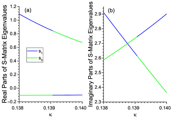 To make clear what points we have in mind, in Figure 3c,d, we plot the cross-sections of the two-dimensional diagram in Figure 2a along the dashed lines. In Figure 3d, we fix the wavelength μm and sweep the non-Hermiticity values starting with . We see that all the scattering-matrix eigenvalues are unimodular at first, so that the logarithms of their magnitudes are equal to zero. At , the first EP appears as the coalescence of the first and second eigenvalues. The symmetry is broken above this EP, where . The third and fourth eigenvalues merge at . Above the latter value, there is the intersection of -symmetry-broken regions. The regions touch at , marked with the vertical red line. This point is the very feature we are interested in here. At this point, the trajectories for the first and second eigenvalues exchange, which is manifested in the line color exchange. This is in contrast to our expectations that the logarithm of the first eigenvalue magnitude (solid blue line) continues decreasing and the logarithm of the third eigenvalue magnitude (solid green line) continues increasing above . The exchange is also observed in Figure 3c at the wavelength μm for the non-Hermiticity parameter .