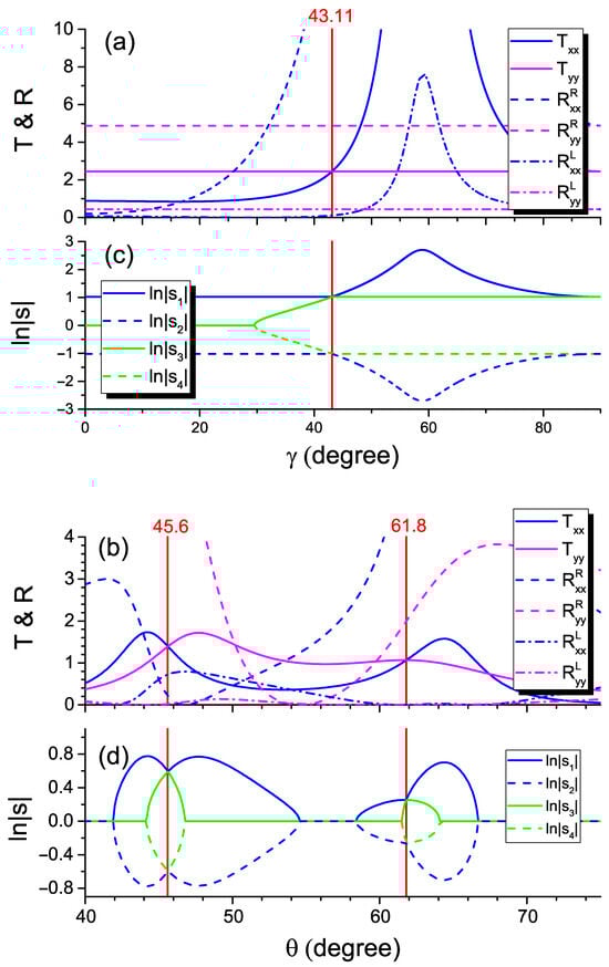 To clarify what happens at the exchange point, we plot the spectra of transmission and reflection respectively in Figure 3a,b. We observe that the transmission coefficients for both polarizations become equal as at the exchange points (see the vertical red lines). It is important to note that these coefficients are larger than unity, since they correspond to the -symmetry-broken regions. The relation between the eigenvalue exchange and the equality of the transmission coefficients can be grasped using the properties of the scattering matrix (2). Indeed, both the transmission coefficients and eigenvalues of the scattering matrix take the diagonal of . Therefore, the simultaneous exchange of eigenvalues and transmission coefficients seems to be quite natural.