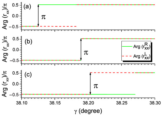 Nevertheless, we can obtain indirect evidence of the topological nature of EPs in our structure by considering exactly these crossings of exceptional lines. For example, in Figure 6, the exceptional lines (solid green and dashed red lines) separate the regions of the -symmetric and -symmetry-broken phases on the plane (, ). As we discussed in Ref. [33] and have shown in Figure 3, the EPs correspond to unity transmission and unidirectional zero reflection. In particular, the exceptional lines in Figure 6 are associated with zeros of the reflection coefficients for light incident from the right () and from the left (), respectively. These reflection zeros can be treated as singular points related to the phase indeterminacy or phase jump. To study the behavior of the reflection phase when crossing the exceptional line, we change the angle for the fixed non-Hermiticity values (vertical lines in Figure 6). The reflection phases for both reflection coefficients and at and are demonstrated in Figure 7a and Figure 7c, respectively. The phases of both reflection coefficients experience a jump on the corresponding exceptional lines that depend on the non-Hermiticity value. The value of this phase jump equals exactly , which is the value of the topological phase accumulated as a result of encirclement around EPs.