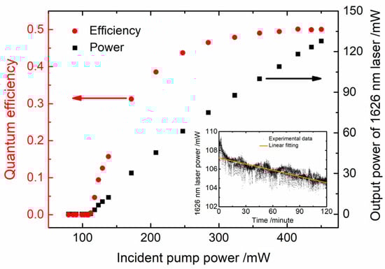 The relationship between 1626 nm output power and the quantum conversion efficiency of the pump laser and the incident pump power. The inset shows the power fluctuation of 1626 nm laser in 120 min.