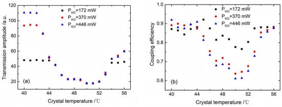 When the crystal temperature is set to 53 °C, the relationship between the coupling efficiency of the transmitted and reflected cavity modes and the pump power was measured, as shown in Figure 6. For the transmitted cavity mode, it is evident that once the pump light reaches the threshold, the growth rate of the transmitted cavity mode is significantly lower than the growth rate before the threshold. However, due to impedance mismatch, the gain of the cavity for the pump light gradually decreases, resulting in a slight upward trend in the transmitted cavity mode signal. In the case of the reflected cavity mode, when the pump power reaches 130 mW, the cavity and pump laser get impedance matched. The coupling efficiency begins to decline gradually, when the pump power increases continually, indicating that the nonlinear losses of the pump light within the cavity gradually lead to an over-coupling status.