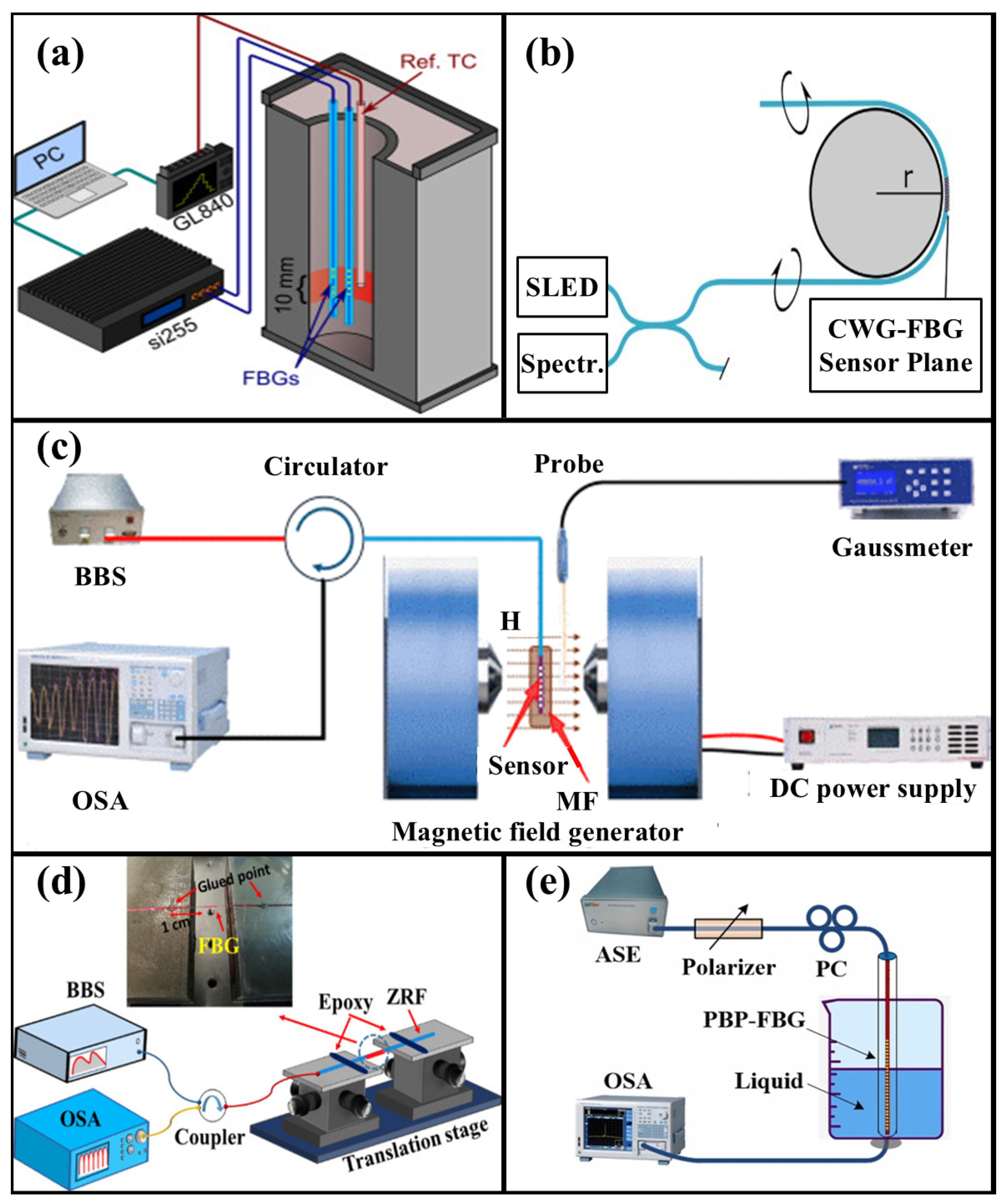 - Liu, H.; Jing, L.; Guan, J.; Deng, Y.; Peng, Q.; Bai, Z.; Liao, C.; Wang, Y.; Wang, Y. Fiber Optic Vector Magnetic Field Sensor Based on Highly Localized Point-by-Point Fiber Bragg Grating. J. Light. Technol. 2025, 43, 5491–5497. [Google Scholar] [CrossRef]