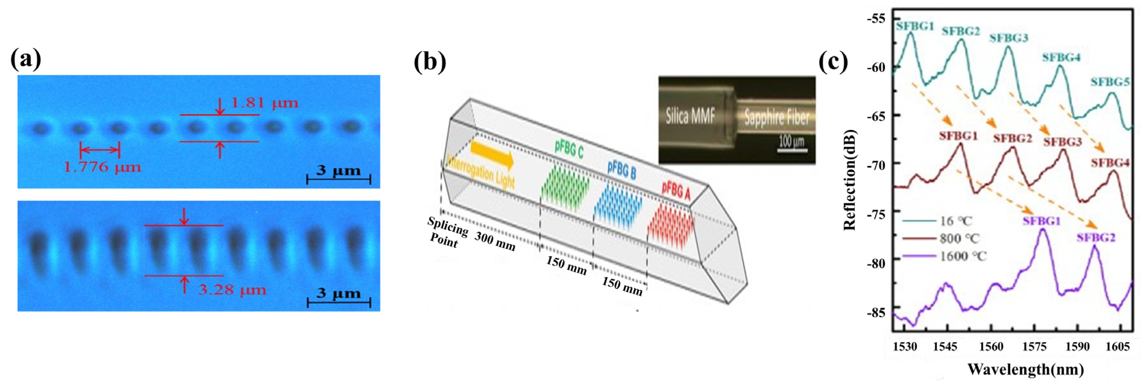 - Wang, Z.; Xu, W.; Wang, L.; Cui, C.; Zhang, C.; Zhou, H.; Nong, H.; Deng, Y.; Yang, J.; Yu, Y.; et al. High-Temperature Stability and Demodulation Techniques Analysis of Sapphire Fiber Bragg Grating Sensor. J. Light. Technol. 2025, 43, 2312–2320. [Google Scholar] [CrossRef]