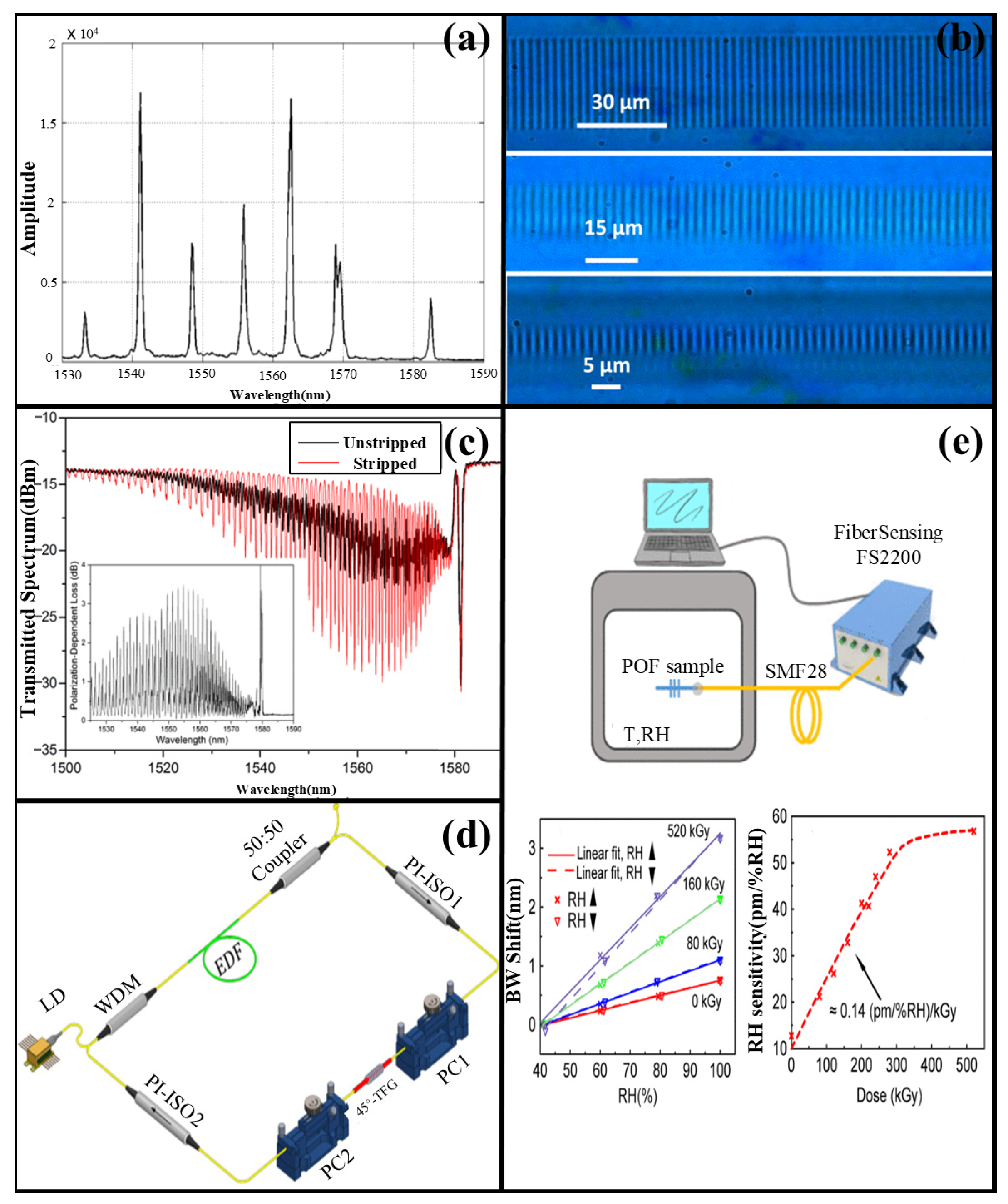 - Chapalo, I.; Gusarov, A.; Ioannou, A.; Chah, K.; Pospori, A.; Kalli, K.; Megret, P. Temperature and RH response of few-mode polymer CYTOP/XYLEX FBGs: Gamma-radiation tuning of sensing properties. J. Light. Technol. 2024, 42, 6262–6268. [Google Scholar] [CrossRef]