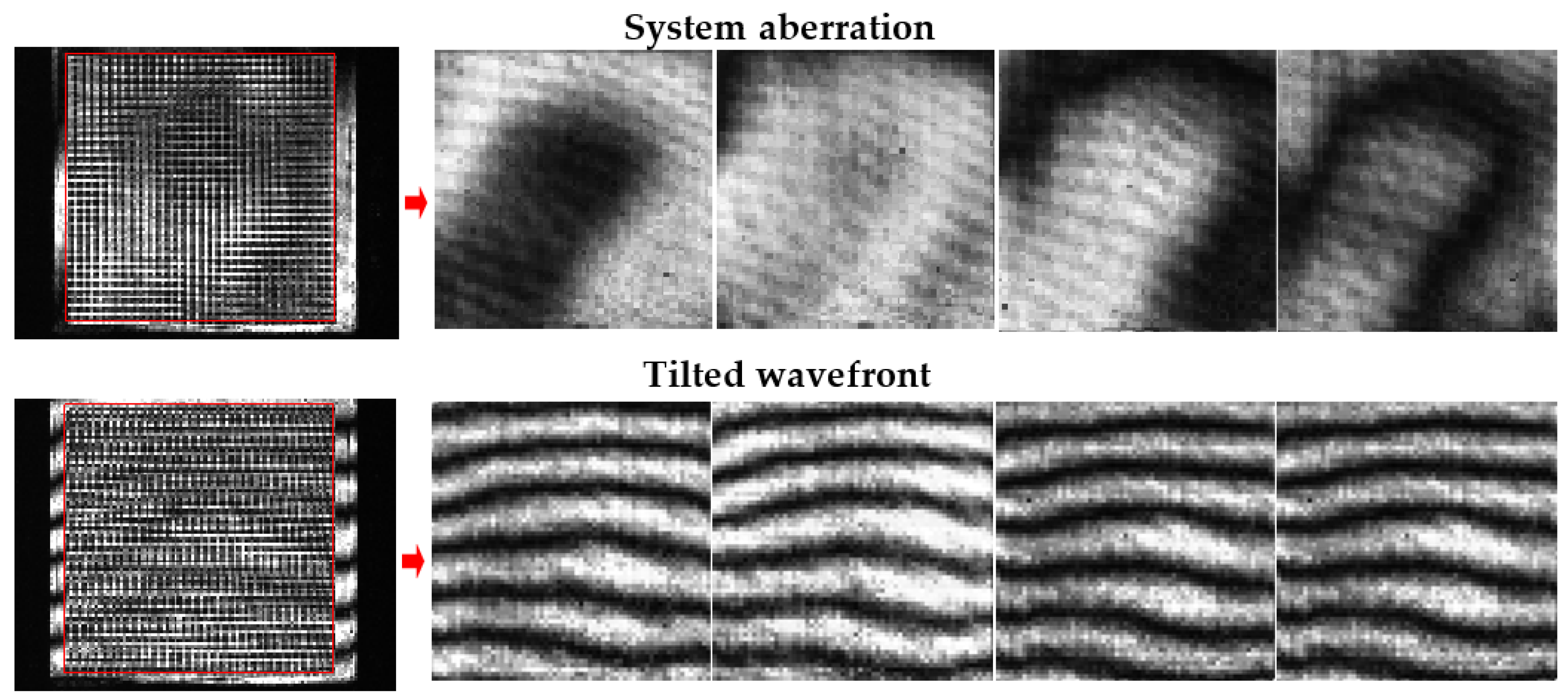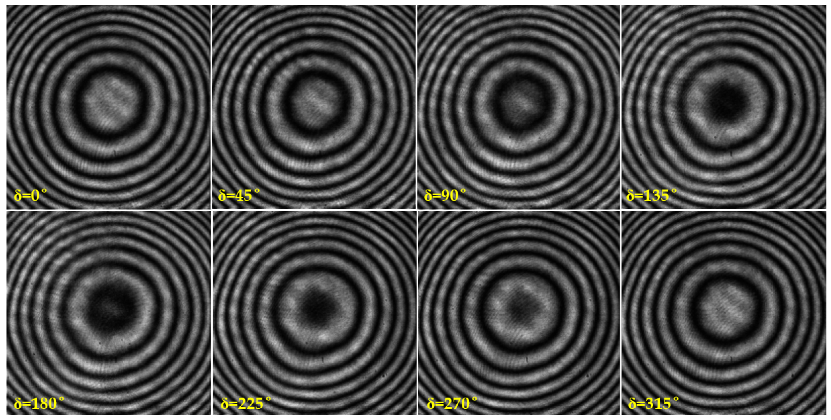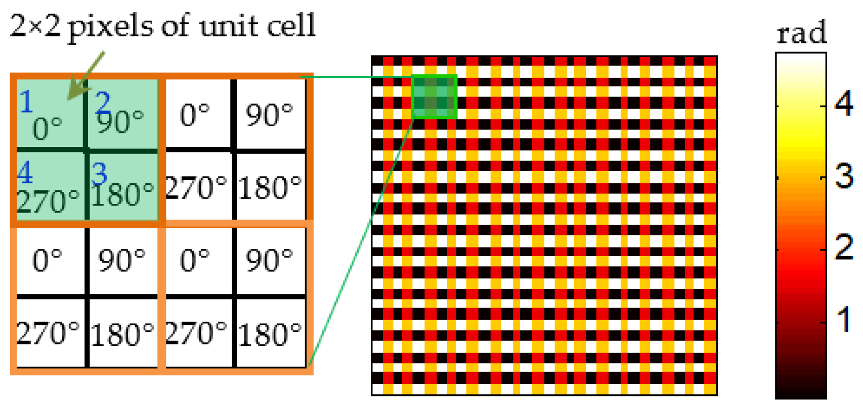 Figure 1. Consequently, four spatial phase shifts of 0°, 90°, 180°, and 270° are simultaneously introduced to each 2 × 2 pixels unit in the reference beam. Only a single frame of the pixelated phase-shifted interferogram is recorded by the CCD camera. The wavefront phase can then be directly calculated from this single interferogram according to the known phase shift distribution pattern.