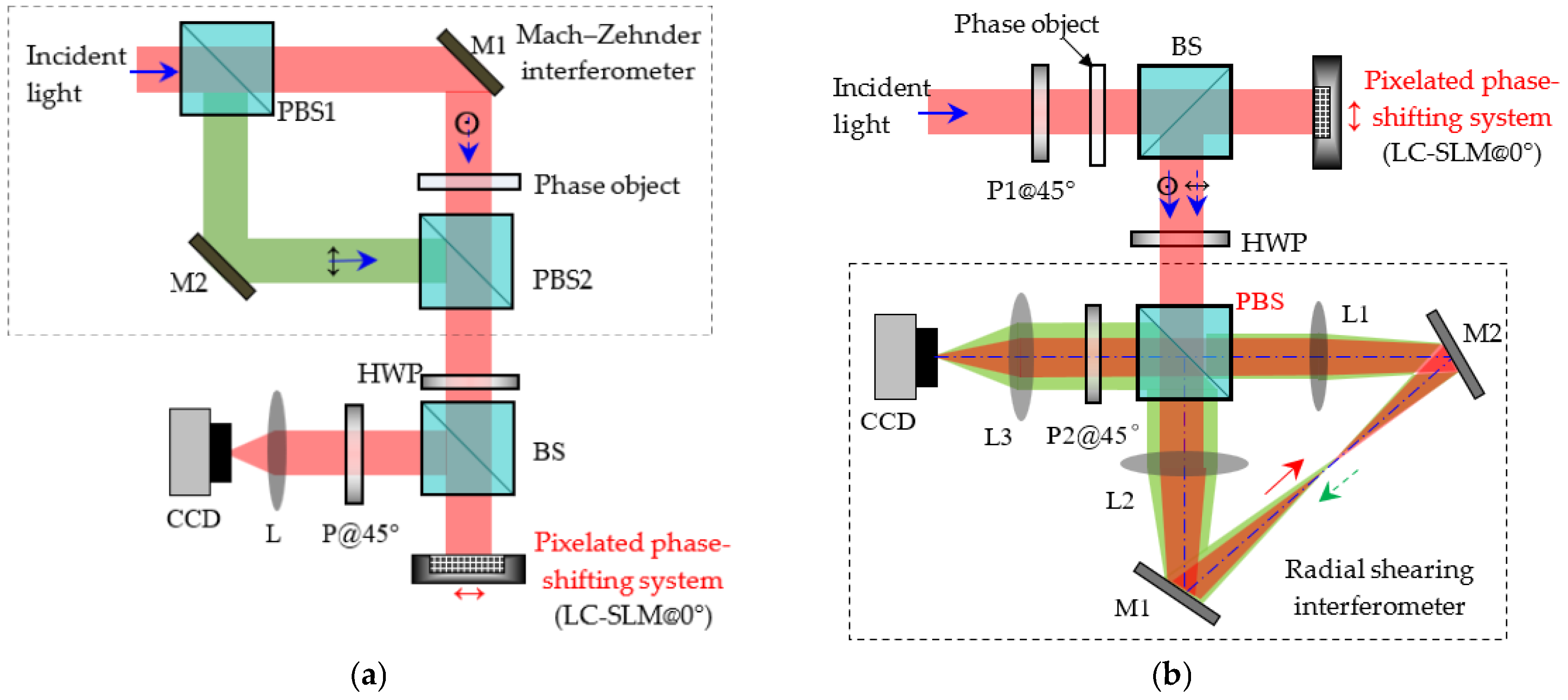 Figure 3 illustrates two representative optical configurations for pixelated PSI based on the LC-SLM, where the technique is applied respectively to non-common-path and common-path interferometers. In the Mach–Zehnder interferometer shown in