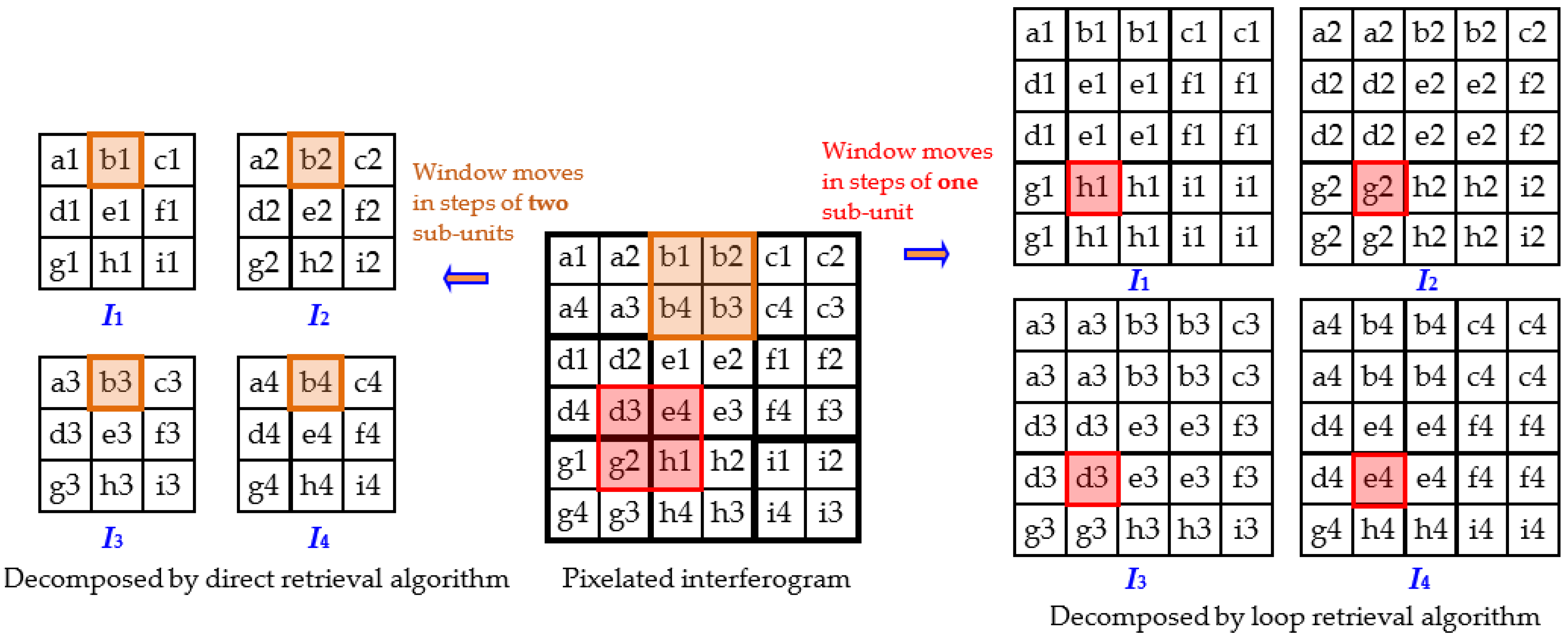 I4). For example, four frames of 3 pixel × 3 pixel phase-shifted interferograms are decomposed from a 6 pixel × 6 pixel pixelated interferogram through using the direct retrieval algorithm, which is shown in the left sub-figure of