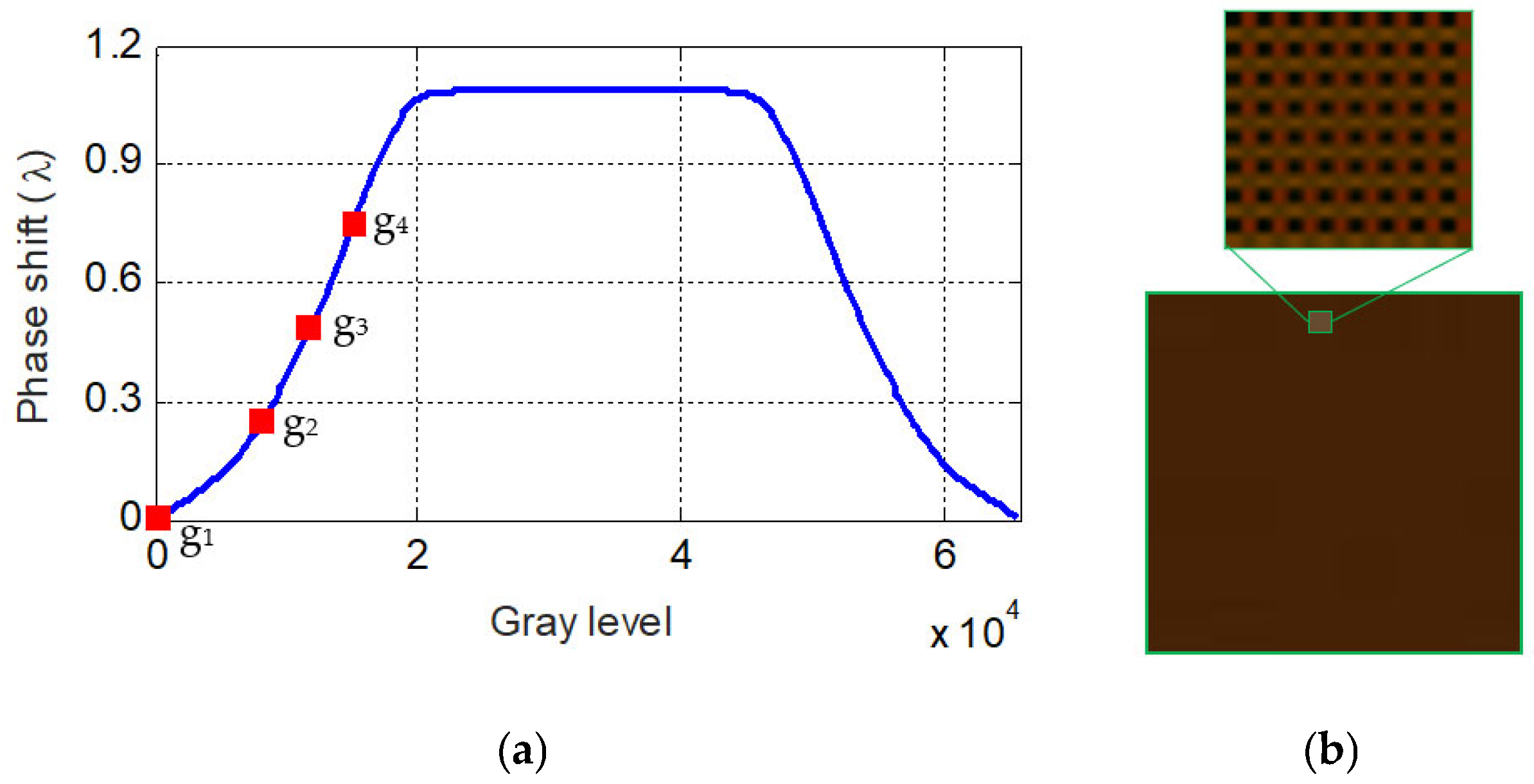 Figure 6a. It is seen that a maximum modulation depth greater than one wavelength (λ = 633 nm) is achieved. According to the calibration data, the required control grayscale values for four phase shifts (0°, 90°, 180°, and 270°) are obtained with the help of adjacent point interpolation, which correspond respectively to four points labeled g1 to g4 in
