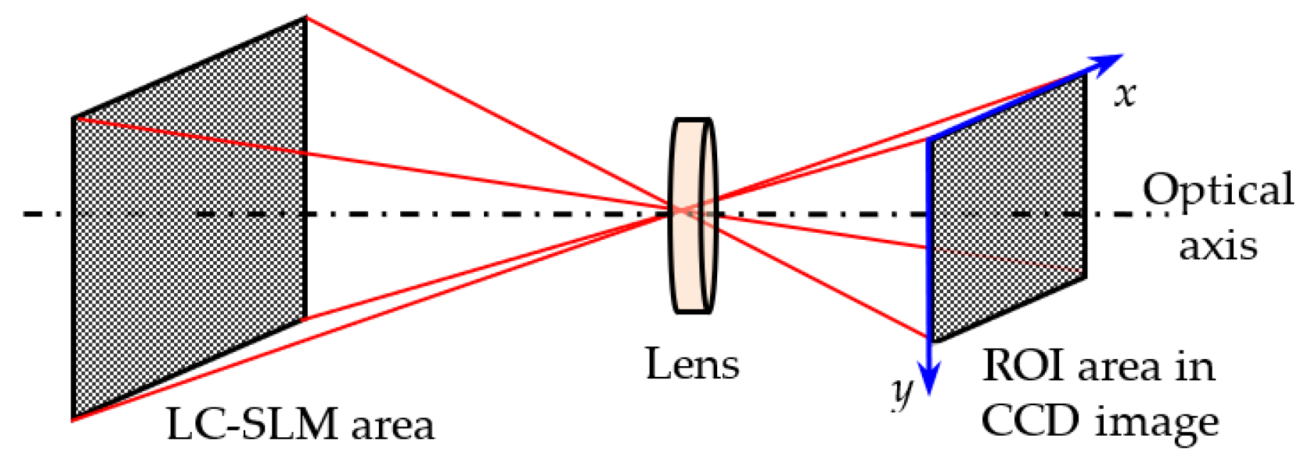 Before actual measurement of the wavefront phase, it is necessary to perform a precise alignment operation on the LC-SLM and CCD, so as to ensure that the planes of the two devices’ target surfaces are both perpendicular to the optical axis and parallel to each other. Under such conditions, the square target area of the LC-SLM will also be imaged as a square area. Moreover, the horizontal and vertical boundaries of the interferogram region should also be strictly parallel to the pixel coordinate axes of the CCD surface. The alignment relationship between both surfaces is presented in