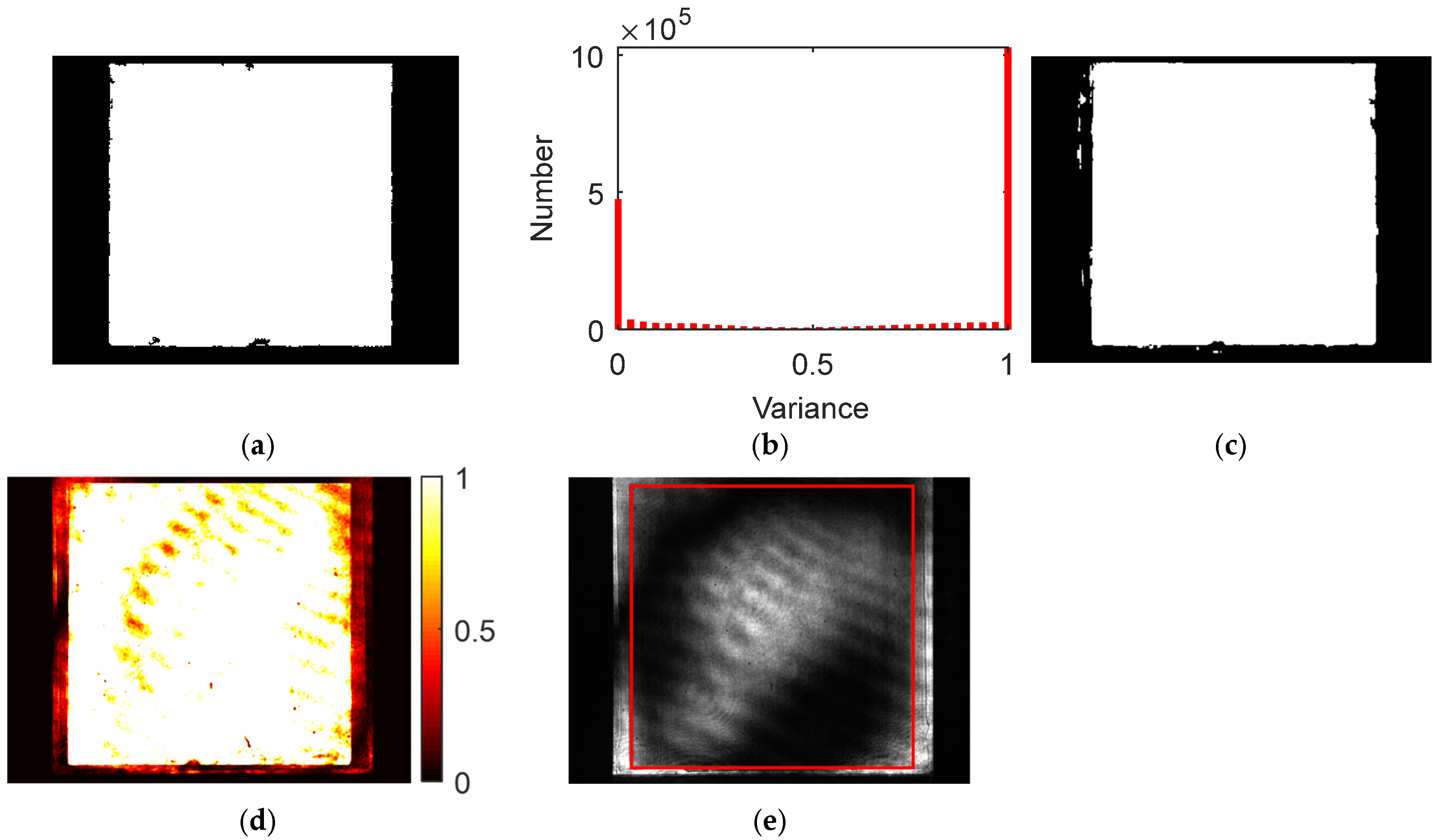 Figure 9b that the variance values mainly fall into two classes (i.e., near 0 and 1), among which the variances within the ROI area exhibit the maximum value and those in the background area exhibit the minimum value. Furthermore, threshold segmentation is performed on the variance image based on Otsu’s method, and the results are shown in