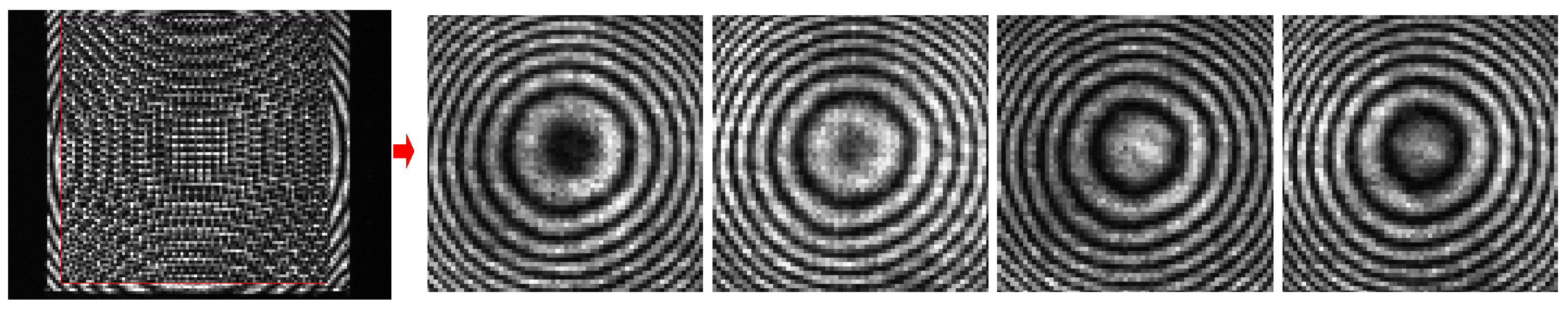 Here, we propose an interference region segmentation method based on wavefront-modulated sequential images, which extracts the region of interest (i.e., ROI) from the CCD image, thereby realizing the pixel matching and alignment operation between the LC-SLM and CCD. In the experimental system, multiple different wavefront phases are randomly introduced by the LC-SLM, and