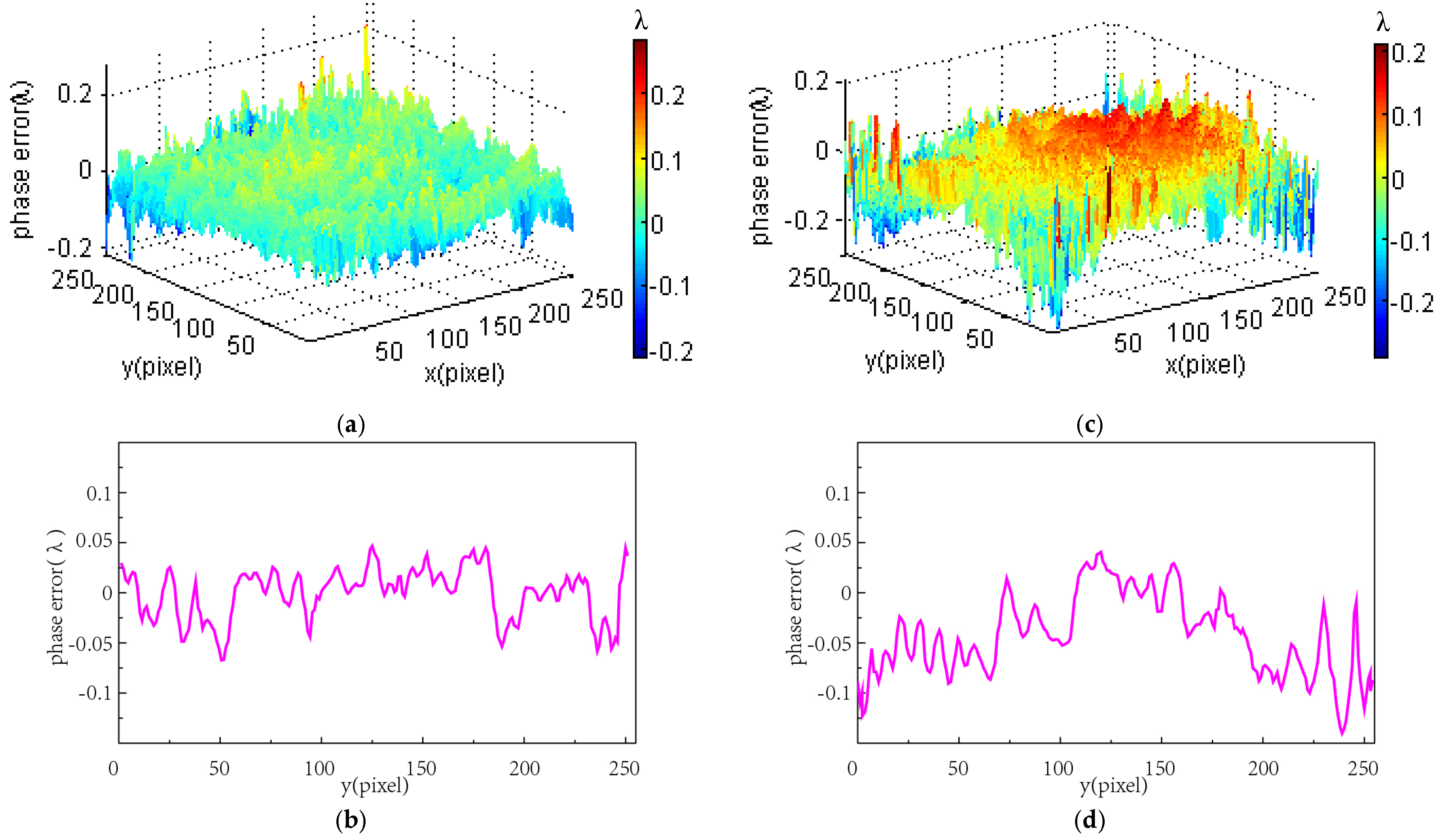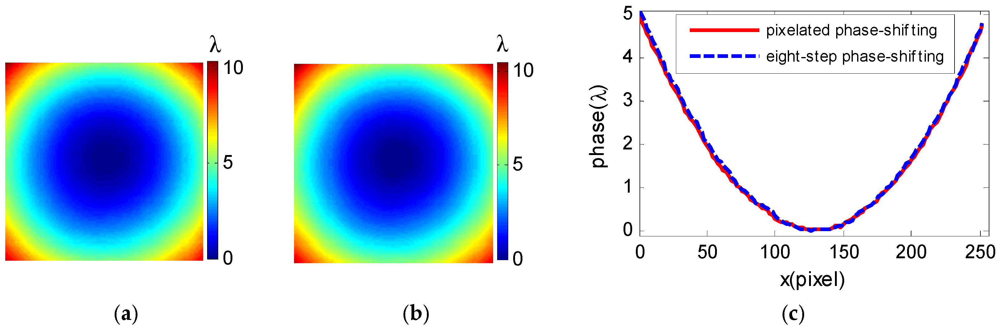 Nevertheless, the ongoing challenges of this method are also evident. The current performance is constrained by the LC-SLM’s intrinsic properties, including its wavelength-dependent response, finite refresh rate (which limits dynamic measurement temporal resolution), and spatial non-uniformity in phase modulation. These limitations are expected to be addressed with ongoing advancements in LC-SLM technology. From a practical standpoint, future work will focus on the precise calibration of local phase modulation characteristics and the compensation of modulation non-uniformity and inter-pixel crosstalk. Enhancing the control over pixelated phase-shifting accuracy is expected to further improve measurement fidelity, paving the way for more demanding practical applications of this technique.